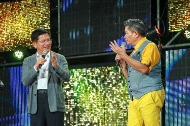 林市長表示,今晚市府邀請大家最喜愛的澎恰恰、許效舜與苗可麗到台中,透過超級夜總會節目共同行銷環保的空汚改善及宗教文化,並肯定宮廟的投入也是改善空汚的重要力量。