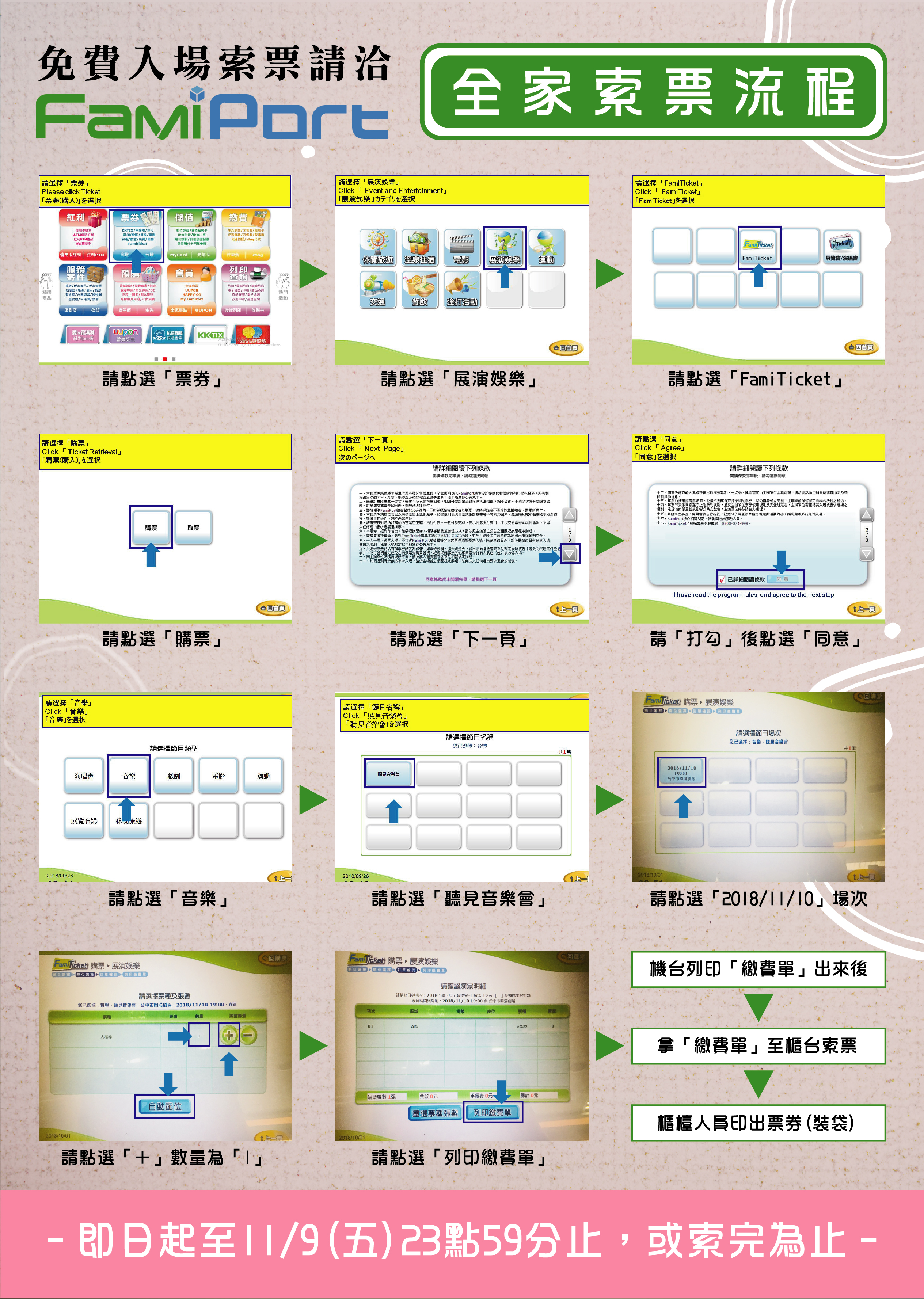 「聽,見」音樂會採免費索票入場,即日起至11月9日23時59分止,可至全家便利商店「FamiPort」機台操作點選「票券」-「展演娛樂」-「FamiTicket」-「購票」-「音樂」-「聽見音樂會」即可免費索票,1人1票,票券數量有限,索完為止;另110公分以下孩童由持票人陪同即可入場。詳情可電洽04-22062111或上Facebook「聽見音樂會」查詢。(10/3*7)*勞工局