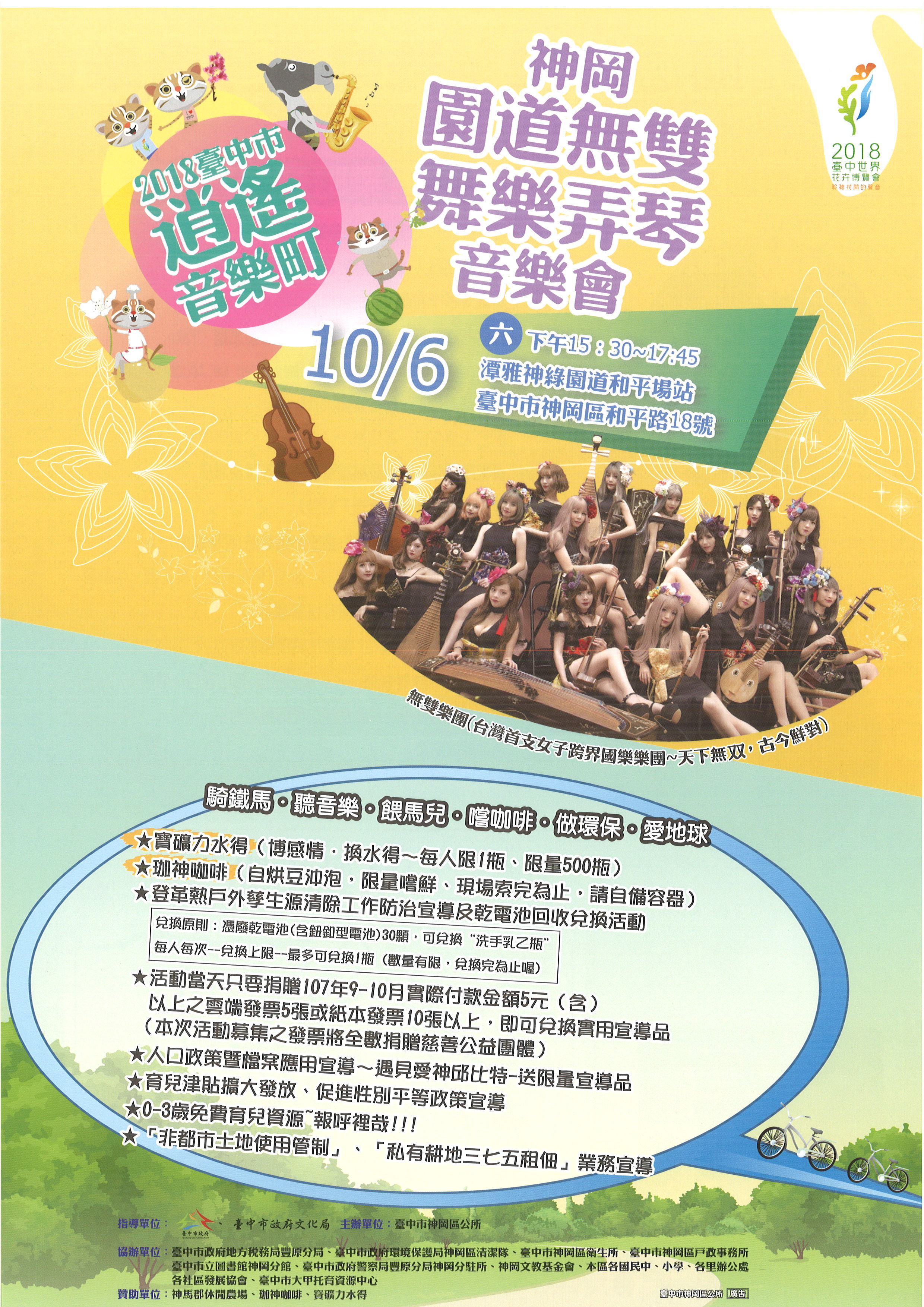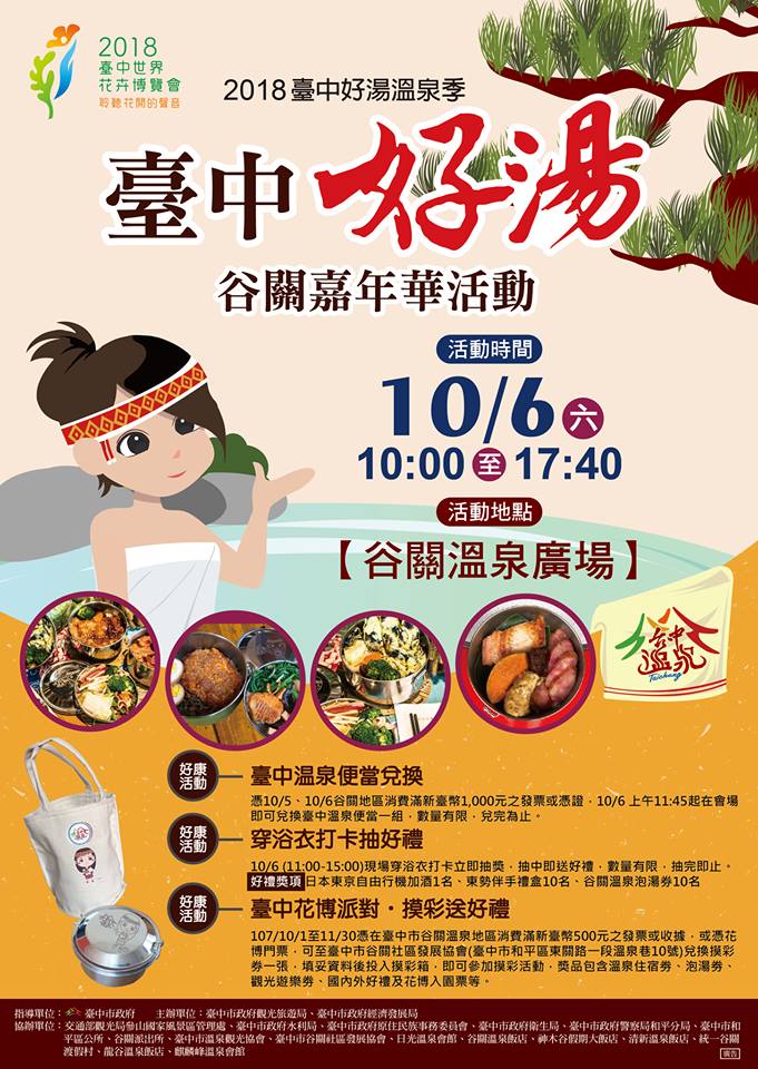 「2018第五屆東海國際藝術節」將於10月6日在東海藝術街柯比意廣場登場,現場將有各式精彩演出、花漾市集、街頭藝人表演及手作月體驗課程,更有限量GO購券及文創商品,展現東海藝術街的獨特性及帶動當地商圈活絡,活動詳情可上東海藝術街商圈粉絲專頁(http://bit.ly/2PjjBti)。「台中好湯溫泉季」將於10月5至6日在谷關登場,今年除在地文創商品創作競賽等系列活動,更嚴選當地食材推出「台中溫泉便當」,以不鏽鋼餐盒及環保保溫提袋包裝,只要在10月5及6日台中好湯溫泉季活動期間,在谷關消費滿1,000元,即可憑發票或收據前往谷關溫泉廣場的服務台兌換一組「台中溫泉便當」,限量200組,兌換完畢為止!本週還有不少展覽、演講等活動,更多資訊,請見「中市週末活動看板1006_1007」。(10/5*6)*新聞局