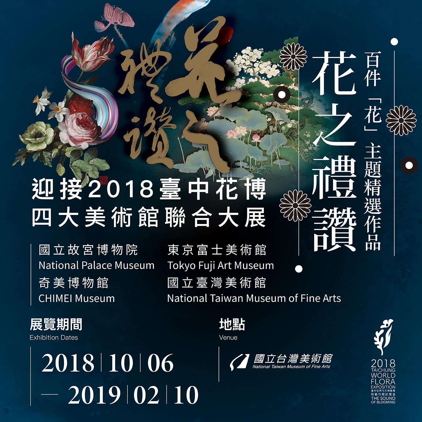 「花之禮讚—四大美術館聯合大展」是跨國性的聯合大展,以「花卉」作為展題,四大美術館各自展現不同風華的典藏,共168件跨越11世紀,涵蓋台灣、華夏、日本、西洋文化,包括國立故宮博物院40件、東京富士美術館25件、奇美博物館30件、國立台灣美術館53件,以及借展台灣當代藝術家作品20件交織出豐富的視覺饗宴。