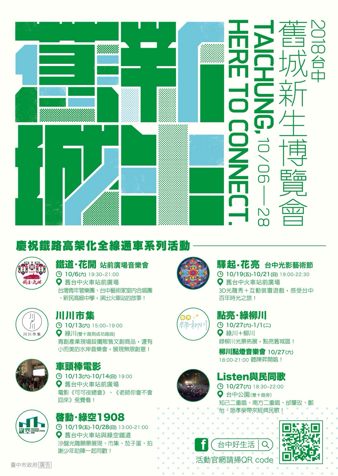 迎接鐵路高架化全線通車,自10月6日起在中區將舉行「舊城新生博覽會」系列活動,以音樂會、綠柳川點燈、光影藝術、民歌演唱、戶外電影、市集等多元形式呈現舊城區嶄新風貌,並邀請知名歌手陳昇在柳川開唱,與大家共同感受台中百年城市的光榮;「花之禮讚—四大美術館聯合大展」聯合國立故宮博物館、東京富士美術館、奇美博物館、國立台灣美術館,將從10月6日起在國美館展出168件以「花」為題的精選作品,並邀請20位台灣藝術家當代創作參展,展期至明年2月10日止,邀您前往共賞繪畫、器物、雕塑、空間裝置、新媒體藝術等作品多元之美。
