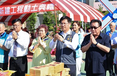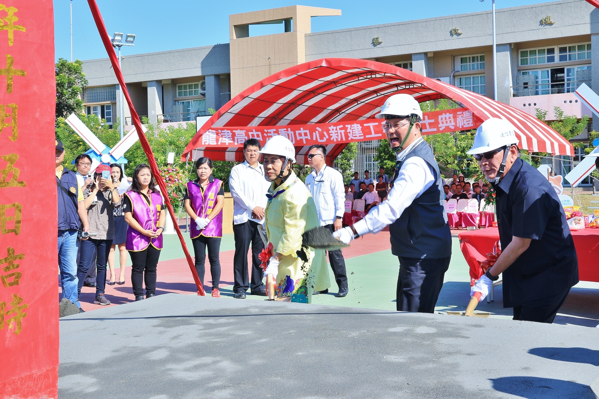 龍津高中為林市長上任後,所推動的第10所市立完全中學,自106學年度成立高中部招生以來,以國際教育、生活美學及海洋體驗為特色發展重點。為提供師生一座可遮風避雨的活動中心,市府特別補助8,000萬元予以興建,今日動土典禮,包括議長林士昌、議員劉淑蘭及當地多位里長皆到場觀禮。