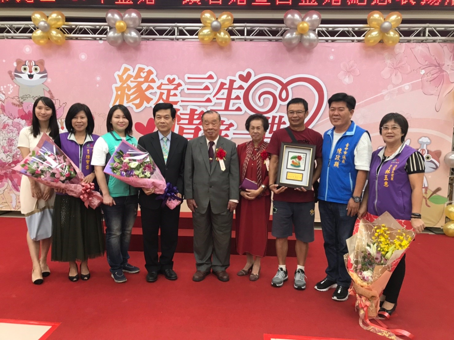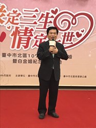 台中市北區區公所今(6)日舉辦107年金婚、鑽石婚暨白金婚紀念表揚,今年活動以「緣定三生 情定一世」為主題,包括3對白金婚、18對鑽石婚及58對共79對夫妻獲獎。市府秘書長黃景茂到場祝賀,並肯定今日接受表揚的夫妻,可作為現代年輕夫妻的表率,盼持續相親相愛、互相扶持一輩子。
