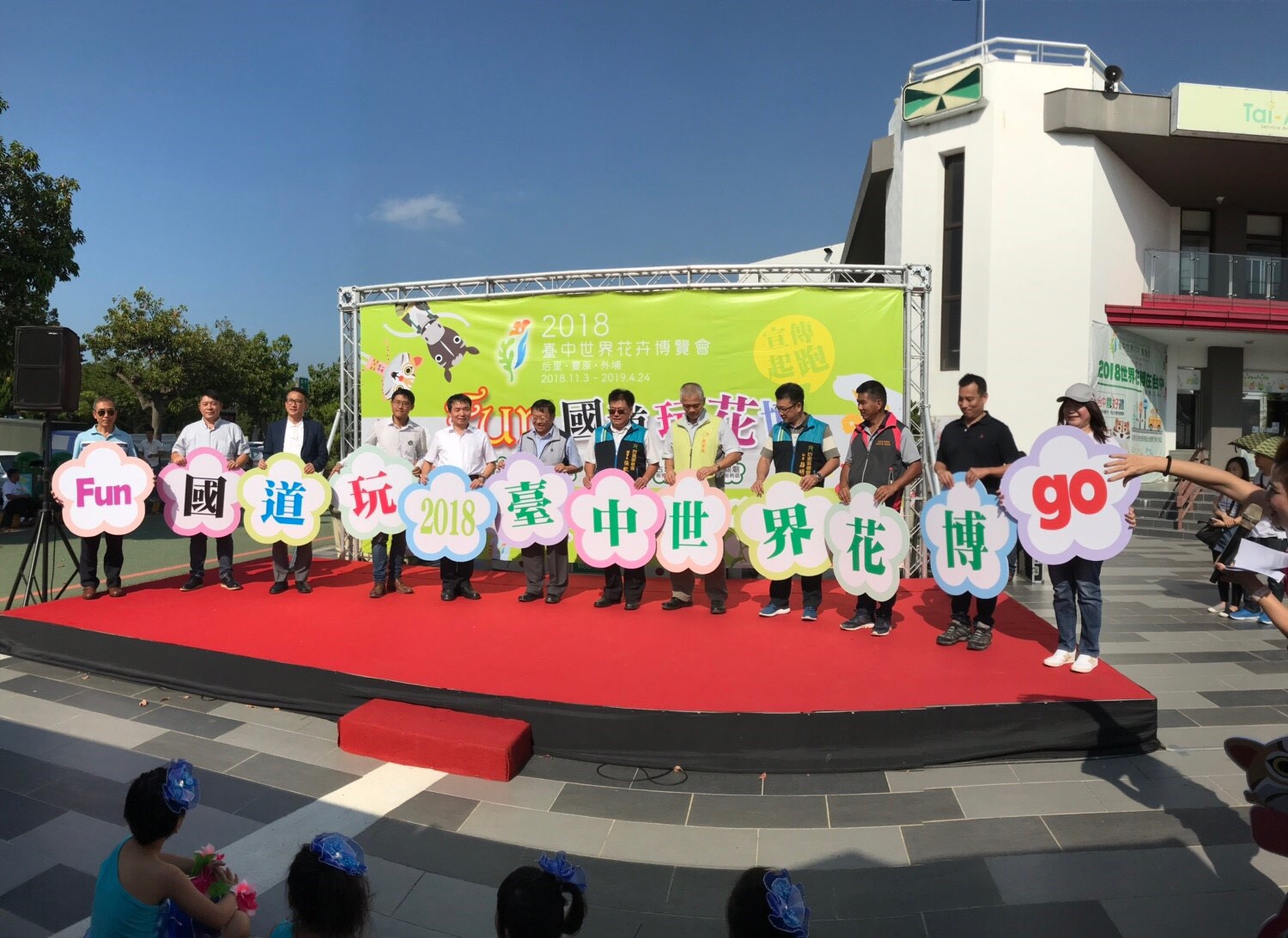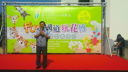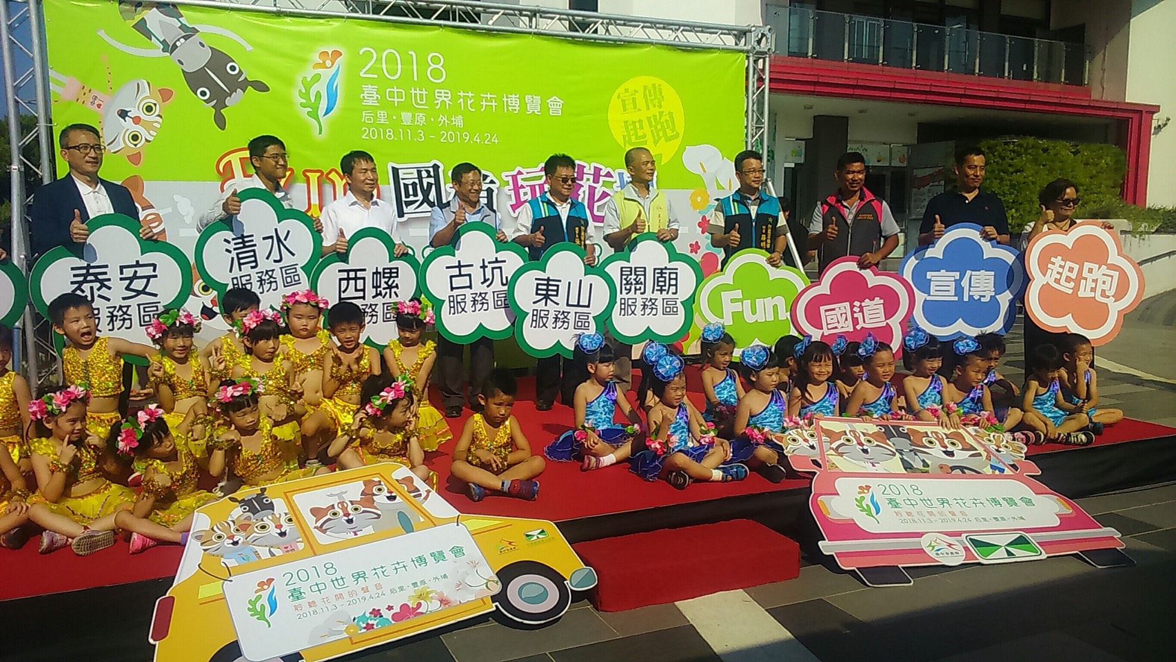 市府農業局今(6)日在國道1號泰安南下服務區戶外,舉辦「FUN國道~玩2018台中花博」記者會,由農業局長王俊雄主持、並宣告國道宣傳活動起跑,盼在擁有百萬流量人潮的國道服務區推廣花博;現場也提供民眾與花卉拍照打卡,並贈送代表台中的蝴蝶蘭、文心蘭等,氣氛相當熱鬧。
