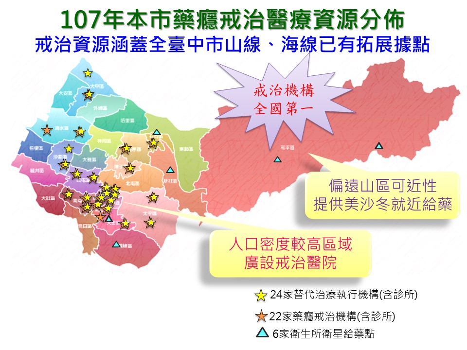 由於藥癮已被視為慢性疾病,需長期接受治療,如美沙冬及丁基原啡因替代療法或心理諮商等,台中市政府積極連結醫療院所,爭取經費建立完善戒癮體系,提供藥癮戒治服務,使藥癮者獲得良好醫療照顧,並進一步整合醫療資源,降低就醫障礙,目前全市共有22家藥癮戒治機構,24家替代治療執行機構,同時也針對人口較多及偏鄉地區設置6家衛生所衛星給藥點,便利需要者使用。