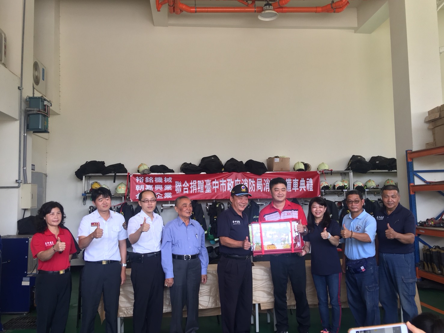 消防局今日在第四救災救護大隊犁份分隊舉辦「裕銘機械、朝嘉興業、金塑企業聯合捐贈消防警備車典禮」,這次捐贈受市議員吳瓊華從中協助,包括吳議員、裕銘機械董事長曾厚忠等人到場,朝嘉興業也派代表出席,並由消防局曾副局長回贈感謝狀,氣氛相當溫馨。