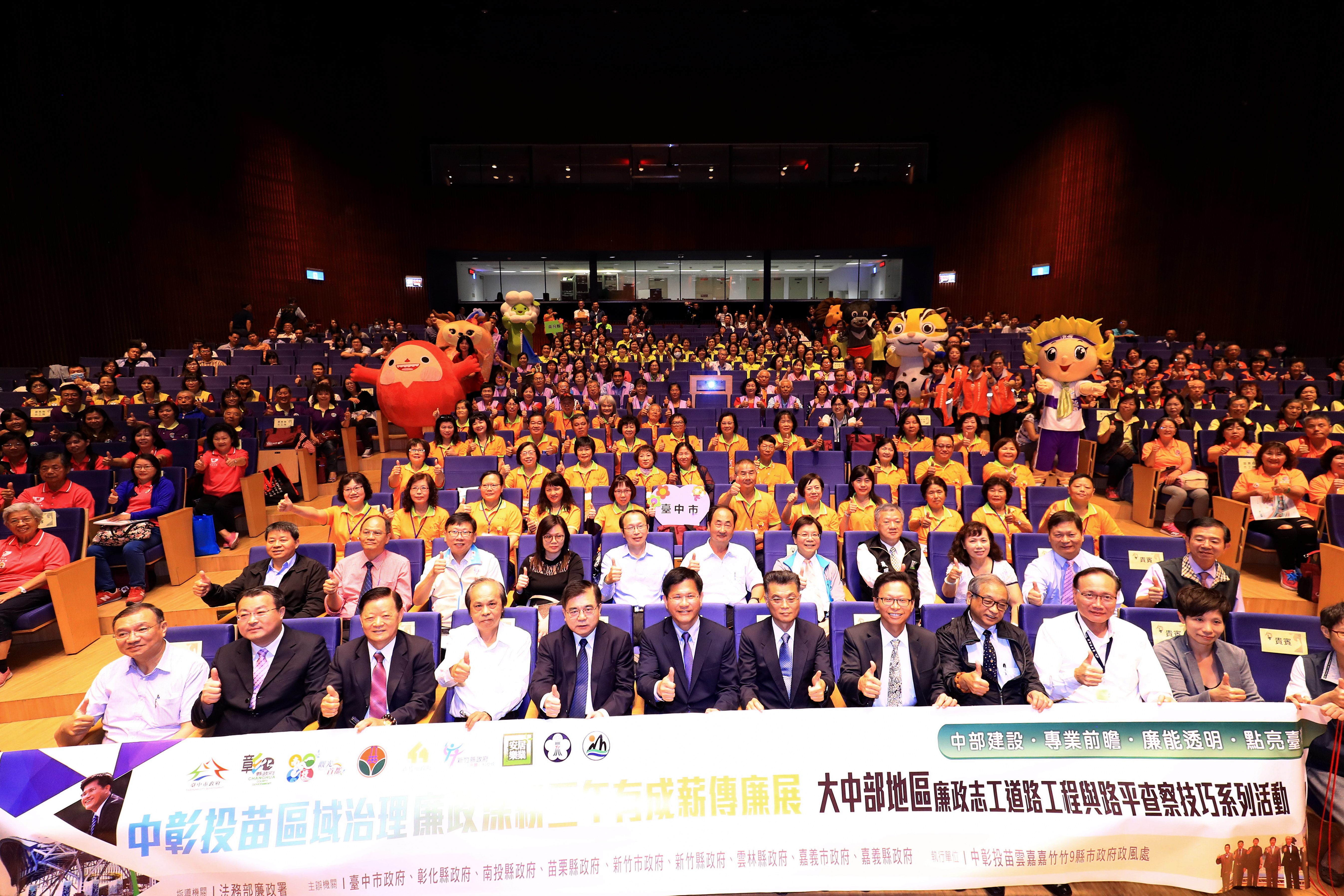 包括林市長、法務部廉政署副署長陳榮周、台中地檢署檢察長張宏謀、台中政府政風處長張榮貴、彰化縣參議田飛鵬、南投縣參議羅雅南、苗栗縣參議邱蓬新,以及九縣市廉政志工、全國各機關政風人員及專家學者等約500多人都到場共襄盛舉。各縣市也都搭配吉祥物到場,場面熱鬧。