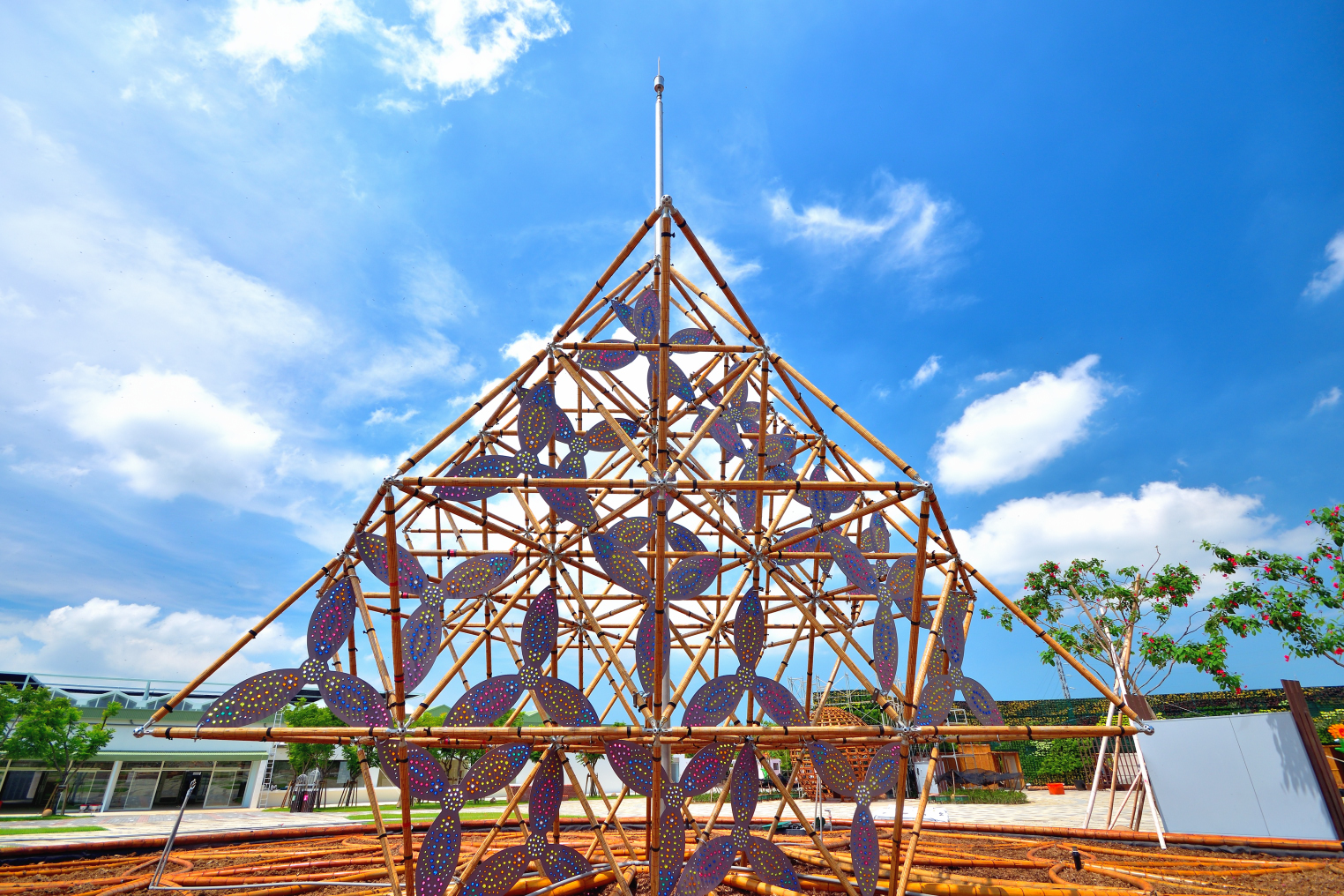 另外,生命之花結合應用新晟光電企業贊助「光粒子」所組成的「生命的萬花筒」,不需要使用任何形式電力,只需要陽光或周邊燈光照射,就能呈現與LED燈相同效果,讓遊客有更加豐富的視覺感受。