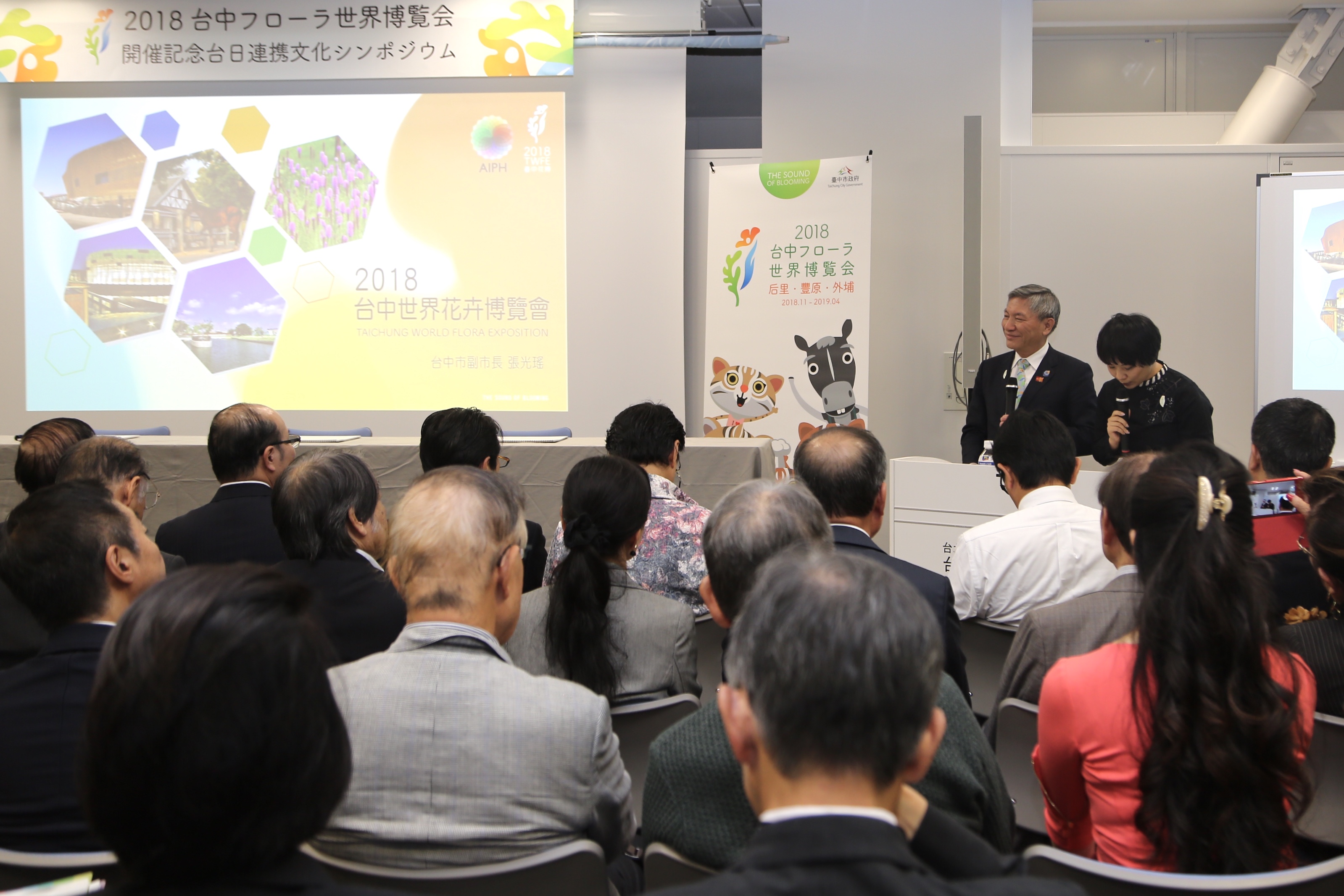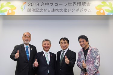 台日聯合文化研討會由台中花博顧問福井昌平擔任引言人,副市長張光瑤、前日本國土交通省都市整備局公園綠地景觀課長町田誠、園藝研究家富山昌克接力進行專題演講,前NHK主播須磨佳津江也錄製影片分享「Opening Garden」概念,駐日代表謝長廷、台灣文化中心主任朱文清也到場共襄盛舉。