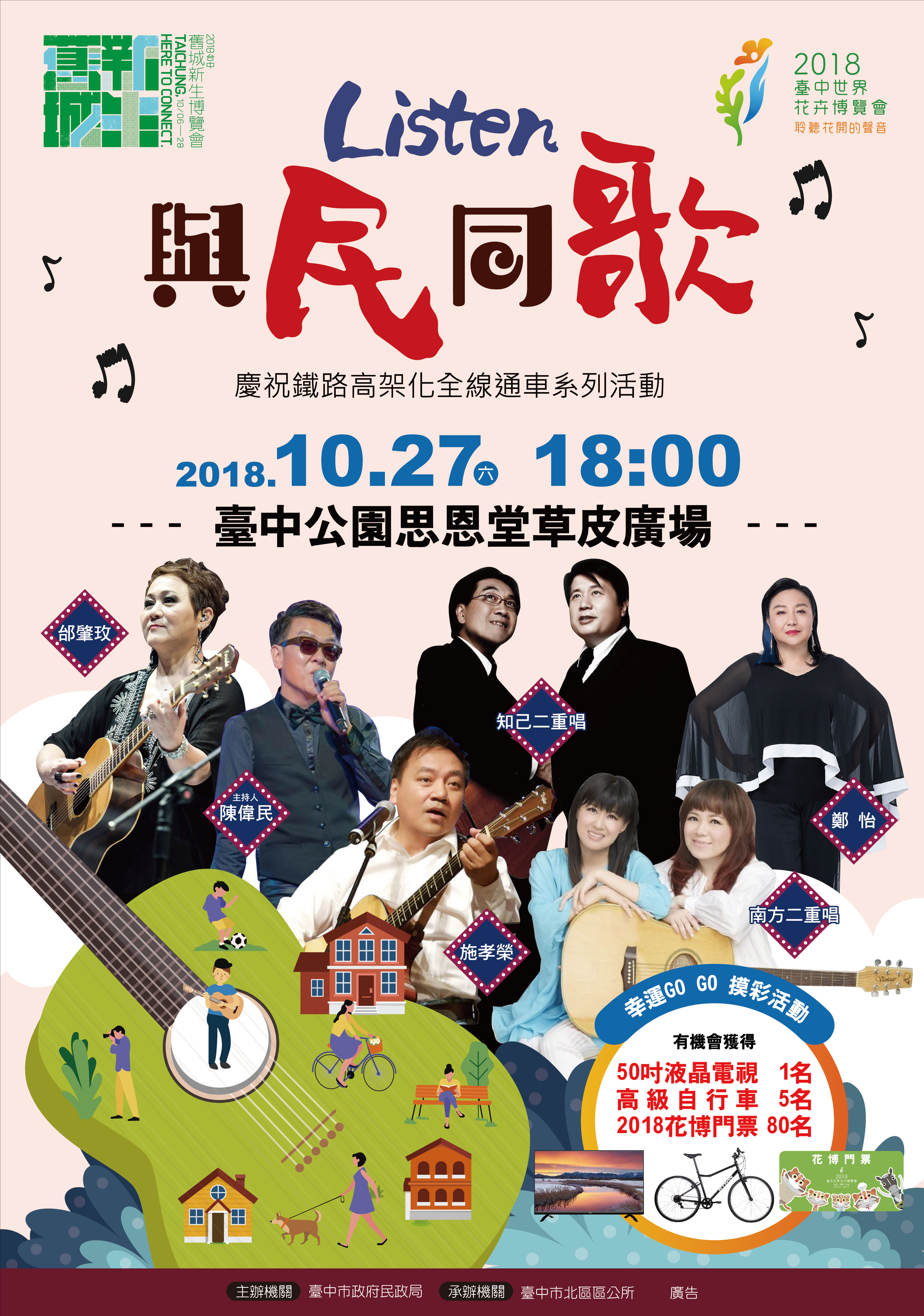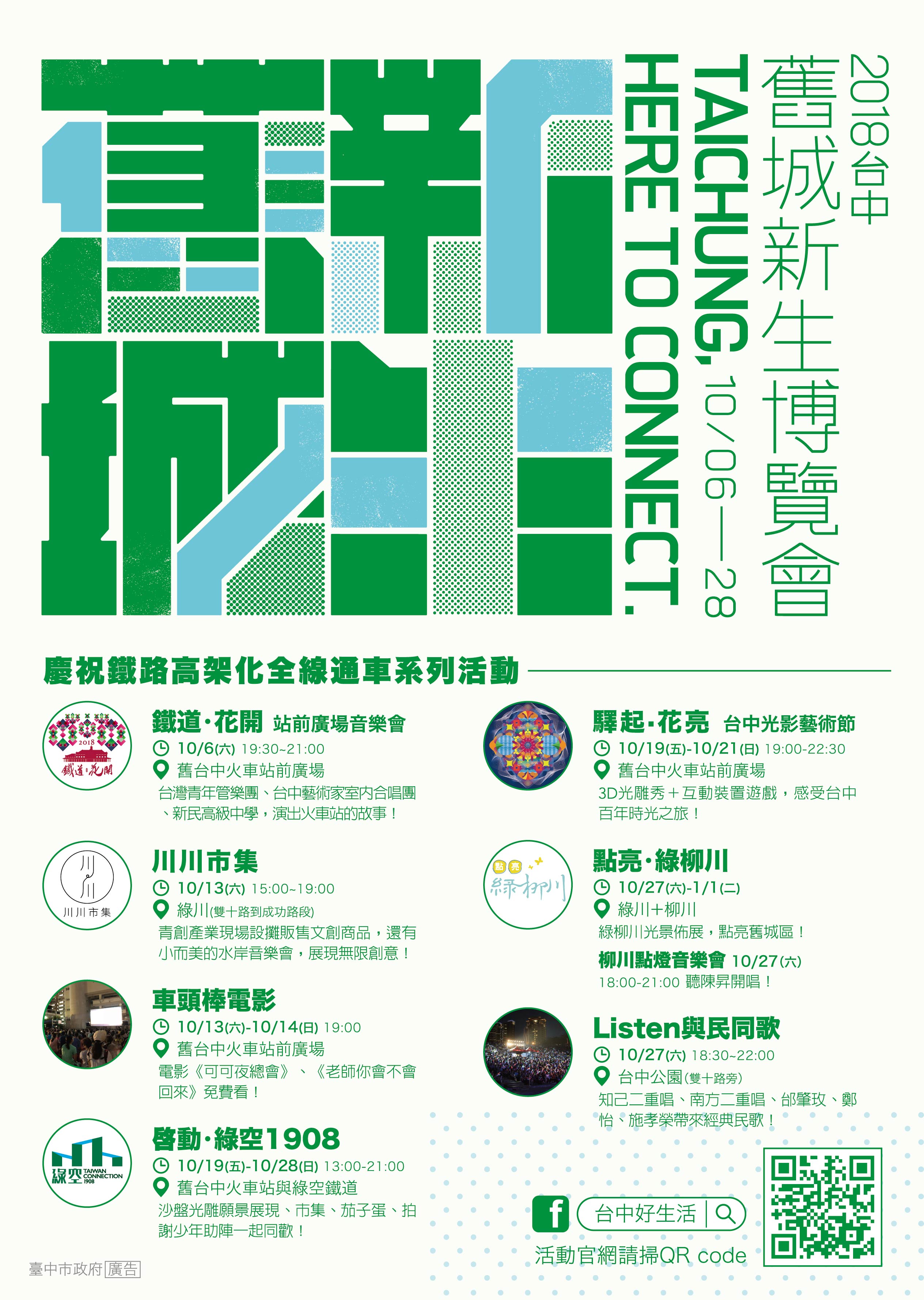台中市政府為迎接鐵路高架化全線通車,自106日起將在中區舉行「舊城新生博覽會」系列活動,其中「點亮 綠柳川」創意光景藝術展暨音樂會,將於1027日起展開,藝術光景佈展自1027日起展至明年11日,音樂會則於1027日晚間6時在柳川水岸登場,並邀請知名歌手陳昇在柳川開唱,要與大家共同感受台中百年城市的光榮。「2018台中親子音樂季」將於1027日至1028日在夏綠地公園登場,邀請知名兒童劇團愛樂劇工廠、玩劇島、聲五洲掌中劇團、等阮返來、跨樂音符樂團及小朋友最喜愛的音樂泡泡奇蹟、可愛小網紅-胖球人生等帶來精采表演,並有童趣遊樂園、野餐、闖關遊戲及文創市集,週末一起來場視覺、聽覺雙饗宴吧!