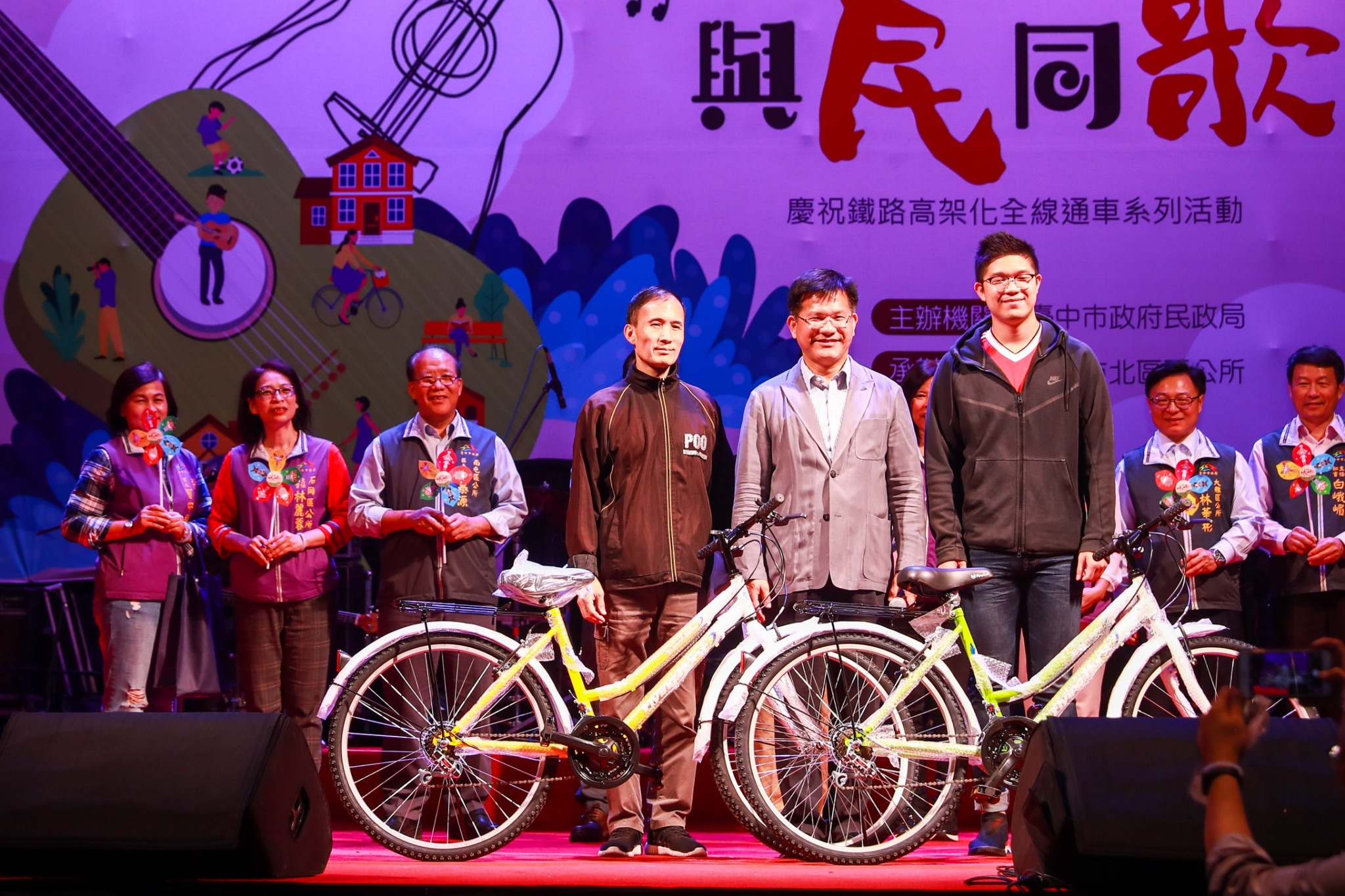 林市長今晚在民政局長副局長盧政遠、徐仙卿等人的陪同下出席「Listen 與民同歌」演唱會,與民眾一起聆聽民歌;林市長也抽出2輛自行車摸彩品,氣氛熱鬧。