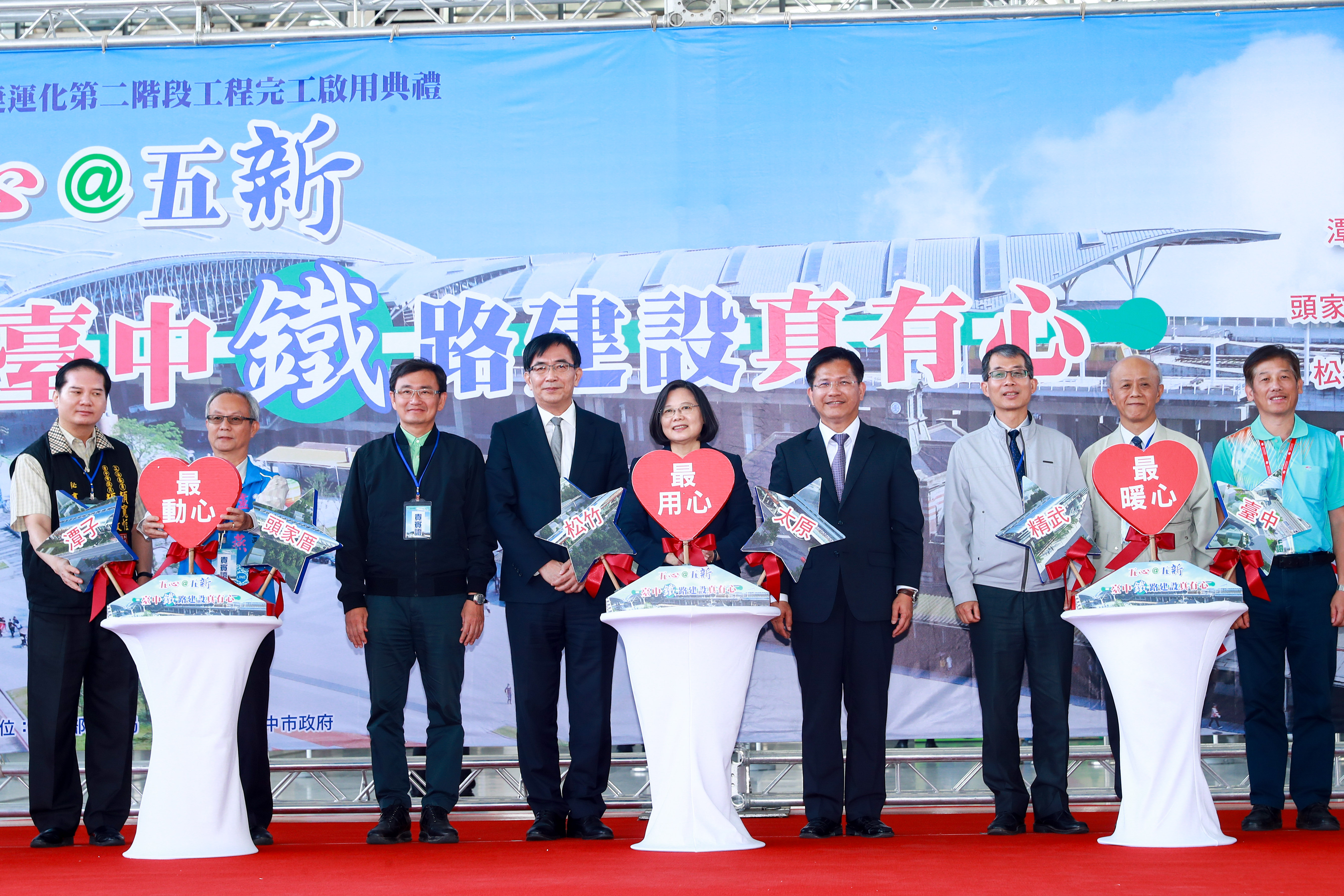 今天的台中車站鐵路高架捷運化第二階段(新五站)完工啟用典禮,包括蔡英文總統、市長林佳龍、交通部長吳宏謀、交通局長王義川、都發局長王俊傑、地政局長張治祥、文化局長王志誠、立委黃國書、市議員邱素貞、鄭功進、江肇國,以及各機關團體代表等共同到場祝賀,場面隆重。