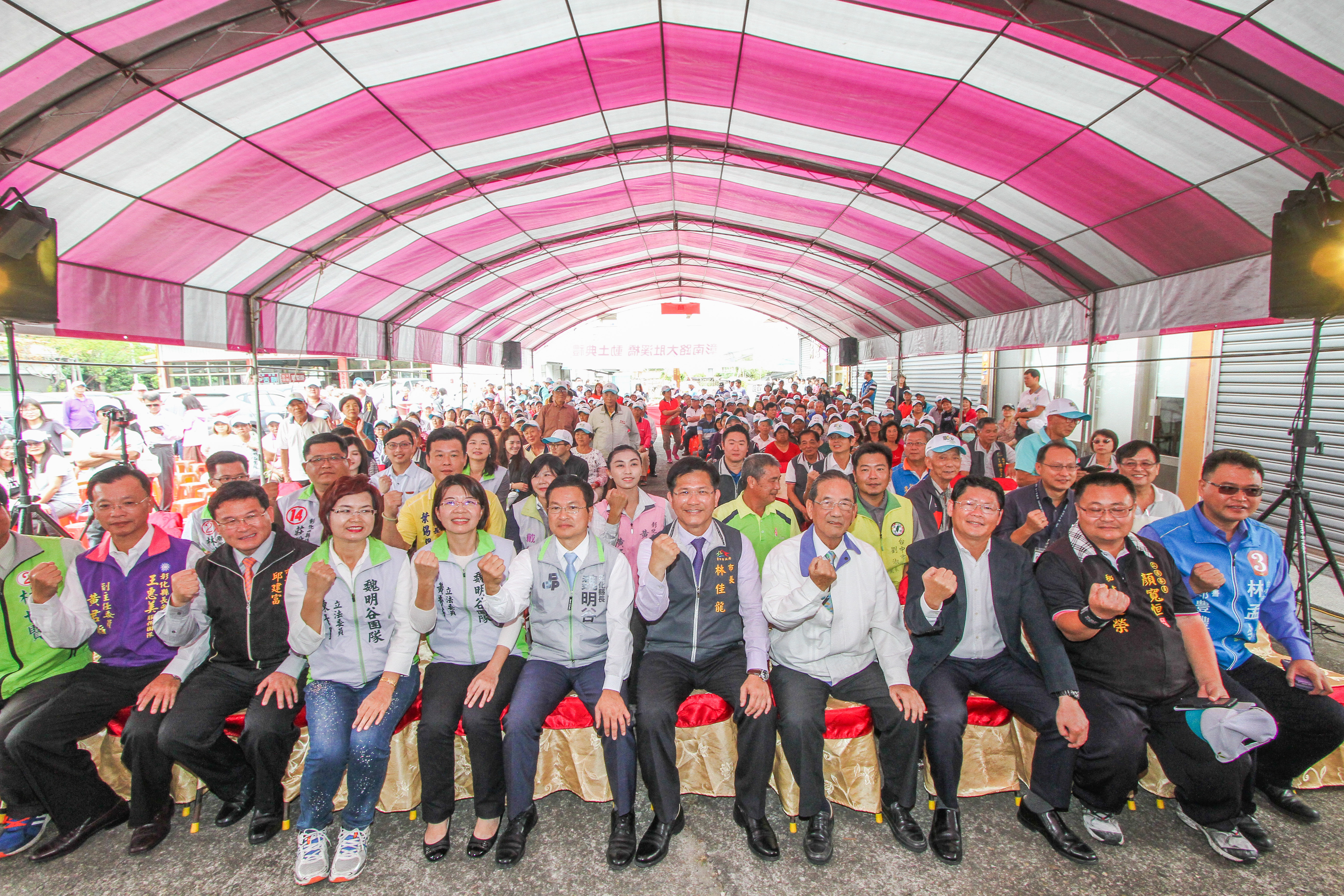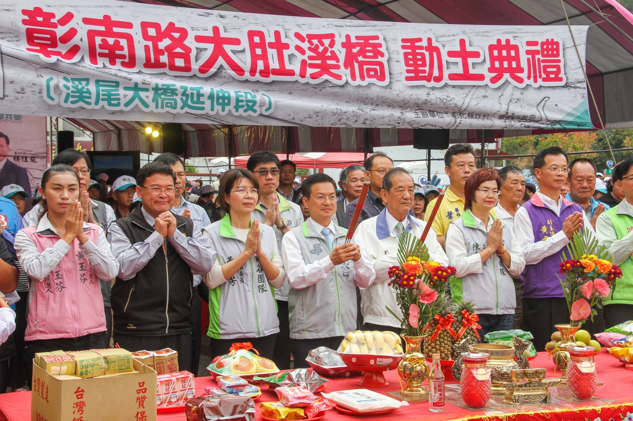 台中市政府建設局今(31)日舉辦烏日溪尾大橋延伸至芬園段動土典禮,由市長林佳龍、副市長林陵三、彰化縣長魏明谷、交通部公路總局第二區養護工程處長陳嘉盈、台中市政府建設局長黃玉霖、彰化縣政府工務處長林漢斌和多位地方民意代表、在地鄉親等均到場見證。