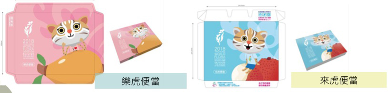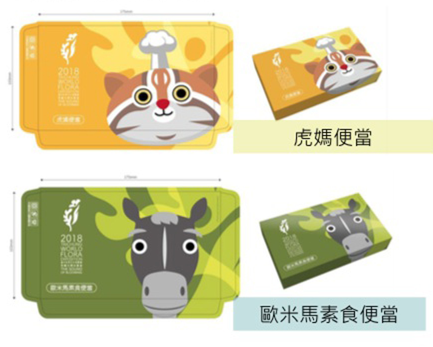 經發局表示,為讓花博遊客擁有多元的美食餐飲選擇,市府精挑細選59家餐飲業者,打造各園區的特色美食。像是花博后里及外埔園區設有「便當專賣店」,提供65、90、120元3種價位便當,紙盒上面印有花博吉祥物的圖案,同時也提供素食便當的選擇,還有350元版的花博紀念便當,可把可愛的來虎便當盒一起帶回家。