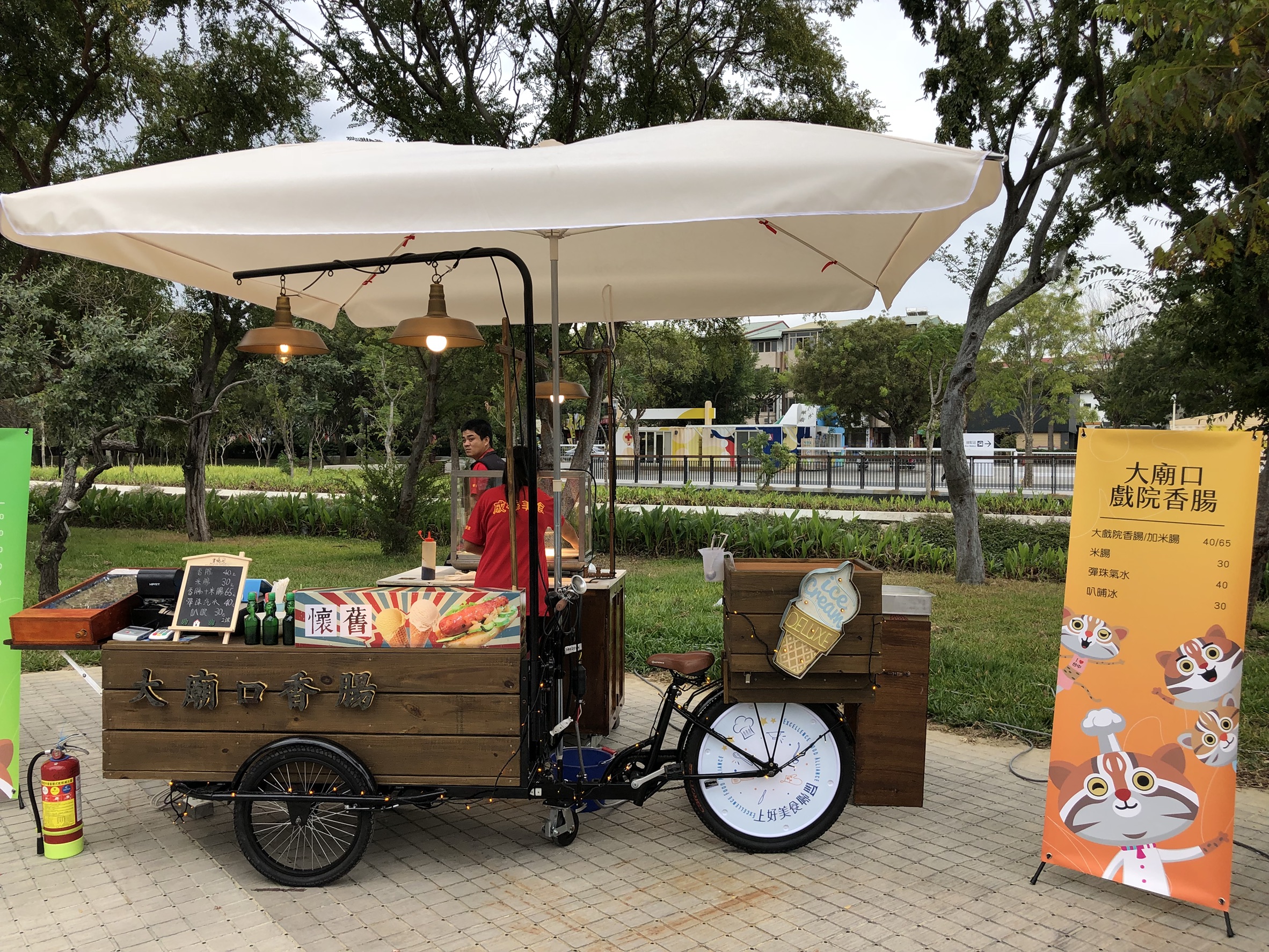 豐原葫蘆墩園區的美食區引進9台極具風格特色的三輪餐車,販售包括咖啡、熱壓吐司、軍艦壽司、懷舊小吃等各式餐點,讓民眾一邊享用美食同時飽覽水岸美景。