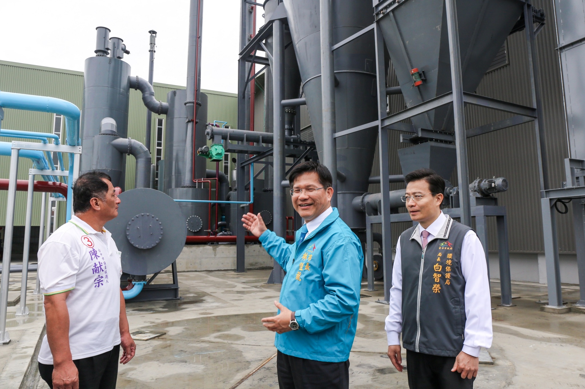 林市長今(1)日在環保局長白智榮、外埔區長陳柏宏等人陪同下,出席「外埔綠能生態園區整建完成暨試運轉祈福典禮」,包括市議員吳敏濟、環保署督察總隊總隊長李健育、奧地利駐台代表傅詩元(Christian Fuchssteiner)、禾山林綠能股份有限公司董事長郭濟安、山林水環境工程股份有限公司董事長郭淑珍等人都出席,立法院副院長蔡其昌、市議員李榮鴻也派服務處代表到場致意,眾人共同祈求試運轉順利平安,並視察園區設備。