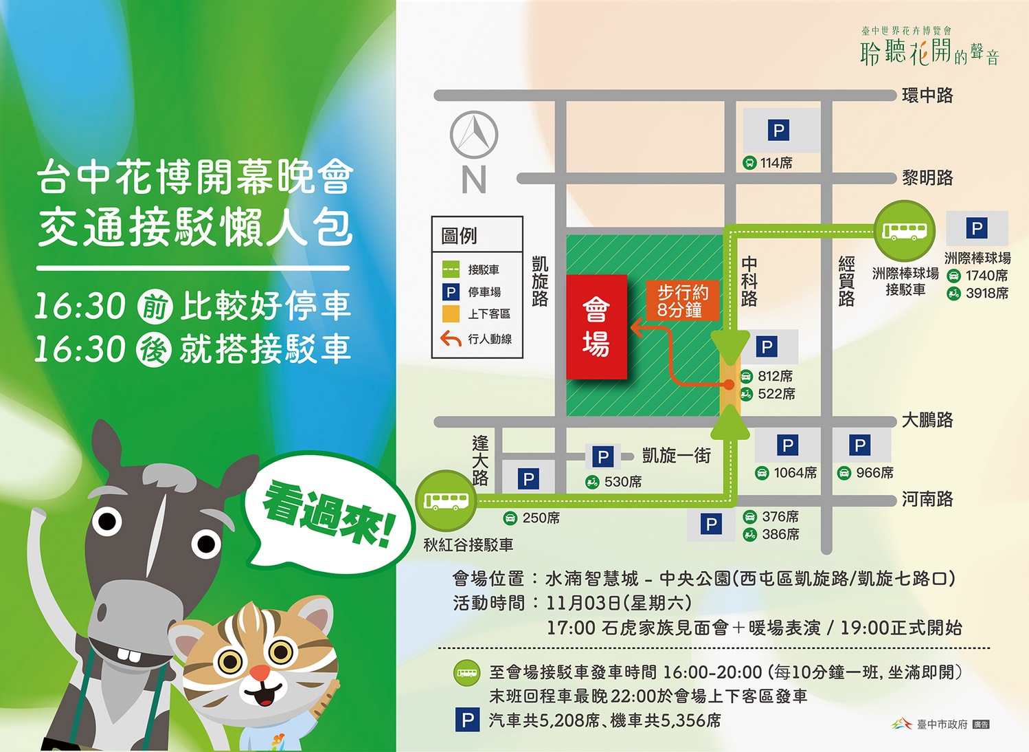 11月3日開幕晚會將在水湳智慧城-中央公園(河南路與凱旋路口往北600公尺處)舉行,活動時間為下午17時至晚上21時,全程免費入場,下午16時30分開放民眾進場,為維持交通順暢,會場周邊將分時段實施車輛管制,禁止一般車輛進入(除公務車及復康巴士外);另市府已規劃兩處免費接駁車,分別為洲際棒球場及秋紅谷,發車時間為下午16時至晚上20時(每10分鐘一班),末班回程車最晚10時發車。