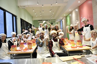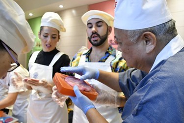西班牙CARMEN佛朗明哥舞團一行18人首先至「宝泉甘味手造所」,它是由百年的老品牌「宝泉食品」成立的豐原第一家糕餅DIY 工廠,在現場師傅教學下,親手揉製製做「大鳳片」,古稱豐聘龜,包進內餡在餅膜上壓出喜歡的圖案了,「軟Q好吃」的口感,讓第一品嚐的的團員直說有趣。
