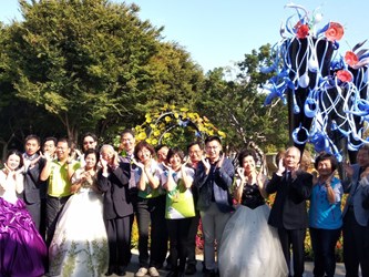 而豐原葫蘆墩園區的開幕儀式,則在「幸福花嫁」為主題的第一區舉行,由6對金婚幸福佳偶在浪漫的琉璃藝術與花海下進場,於副市長林依瑩和現場遊客的見證下緩緩進場,並為花博園區揭幕。