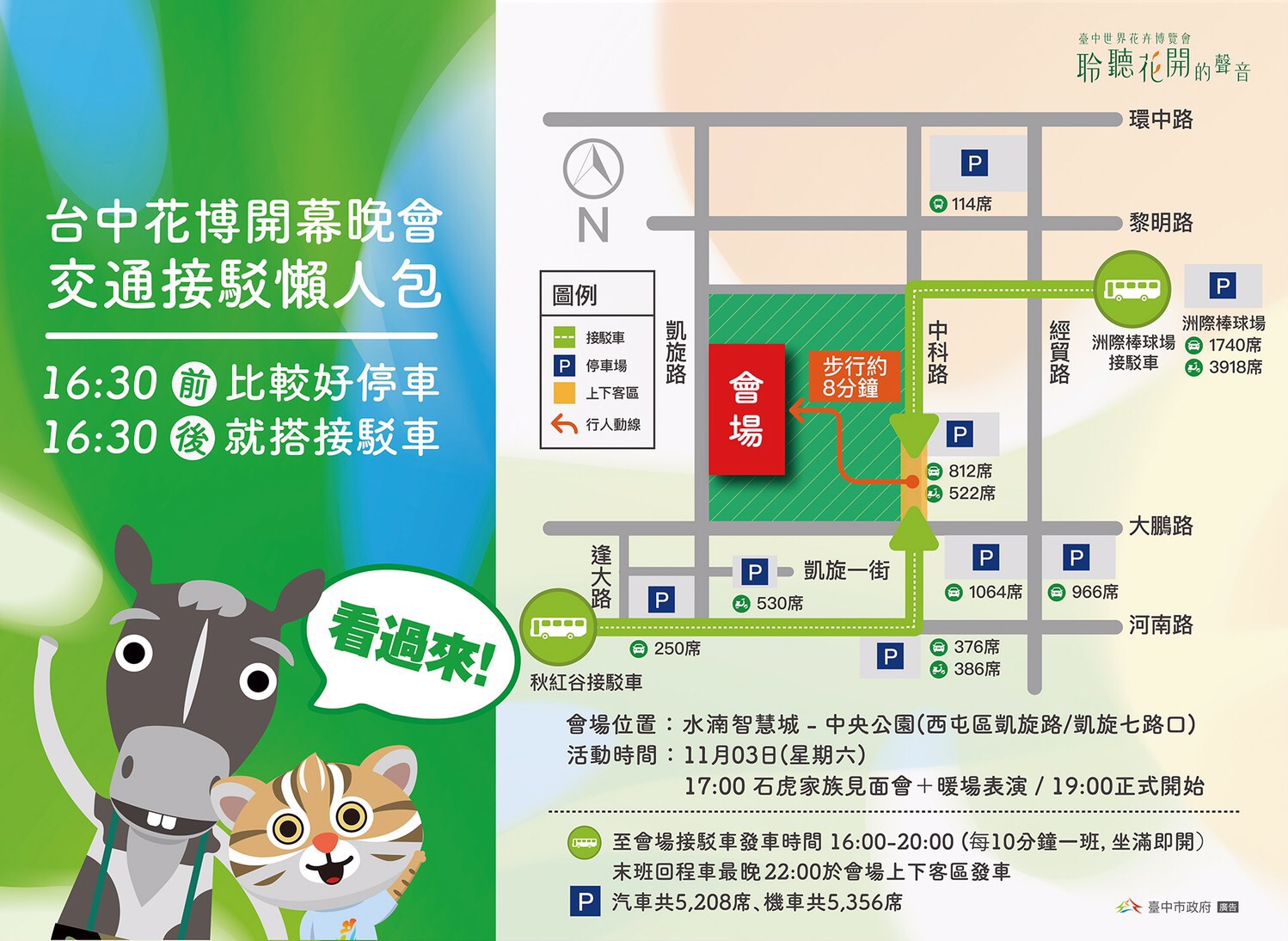 台中花博今(3)日盛大開幕,開幕大型晚會傍晚將在水湳智慧城(西屯區凱旋路、凱旋七路扇形空地)舉行。為使交通順暢,台中市政府交通局進行2階段車輛管制,並規劃多處停車場。下午4時30分前可自行開車或騎車前往,之後開始管制,可在秋紅谷及洲際棒球場搭乘免費接駁車,每10分鐘一班車,歡迎踴躍共襄盛舉。