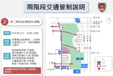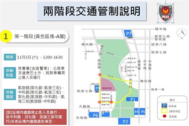交通局長王義川表示,開幕晚會當日實施兩階段交通管制,管制方式、路段及時間: