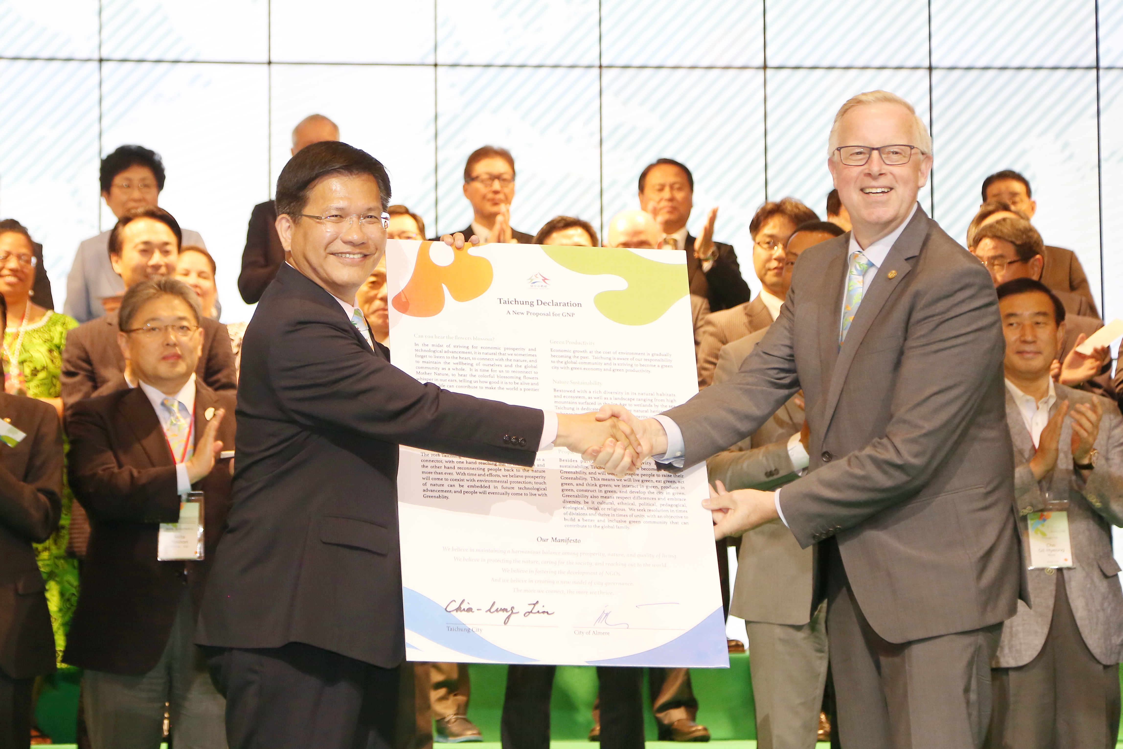 隨後,林市長將《台中宣言》遞交給國際園藝生產者協會(AIPH)會長Bernard Oosterom,象徵台中所提出的全新GNP定義走入國際,這份宣言已成為AIPH正式官方文件,為未來各國城市舉辦花博,樹立起新興典範。