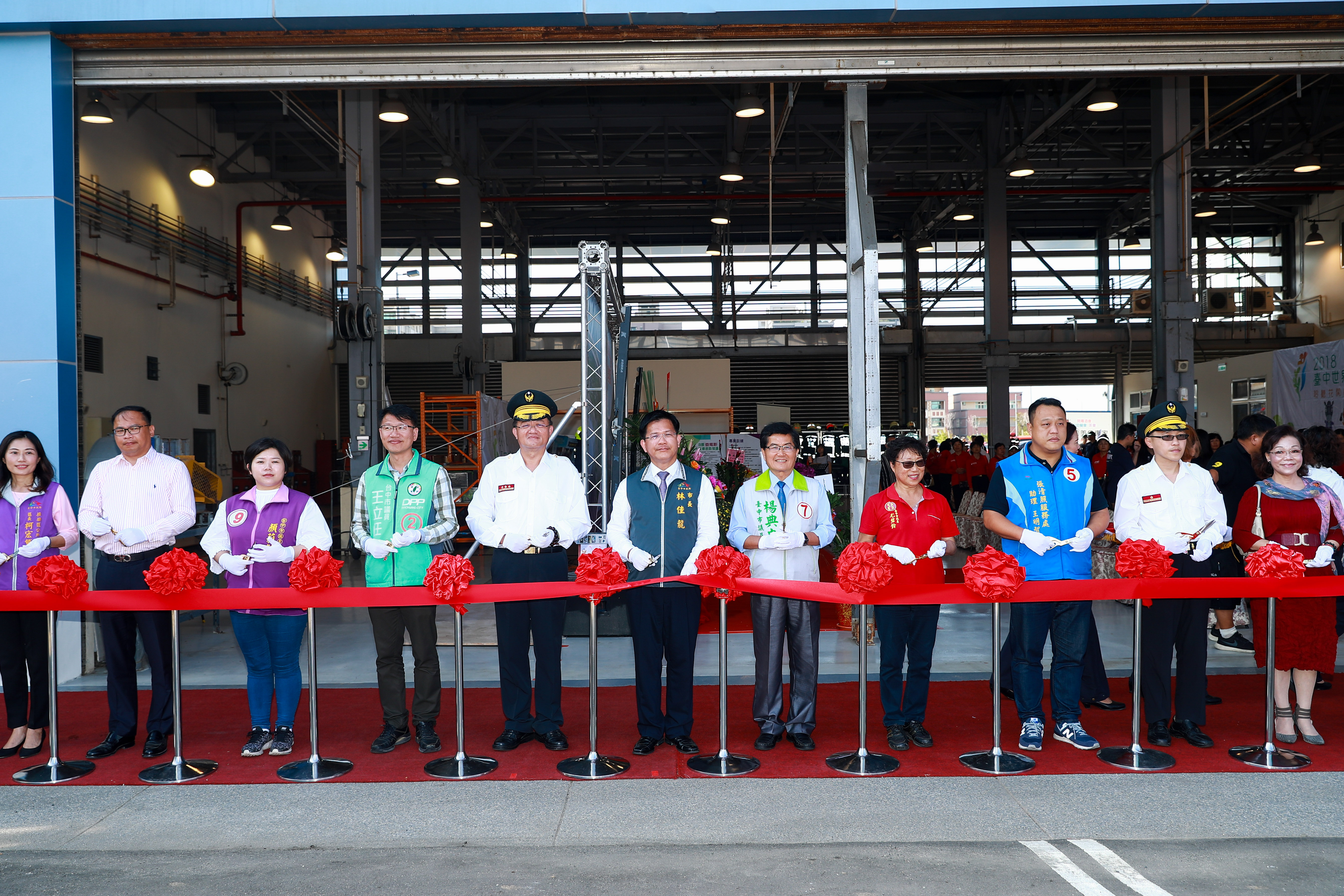 市府消防局今日舉辦「梧棲分隊廳舍落成及安全駕駛訓練基地啟用典禮」,由林市長、消防局長蕭煥章、交通局長王義川、市議員尤碧鈴、楊典忠、王立任、顏莉敏等人剪綵揭牌。