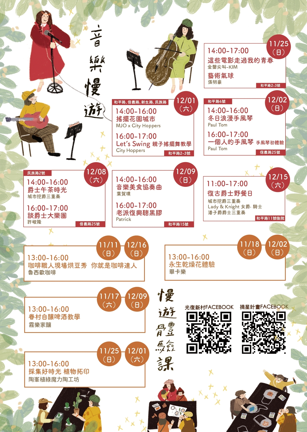 活動期間,基地內也舉辦多場集章闖關遊戲,只要集滿基地紀念戳章,即可獲得限量摘星基地精美明信片一套。此外,1125日至129日的週末下午時段,還有一系列爵士音樂及藝術表演,1215日更舉辦爵士草地野餐日,歡迎一起放慢步伐,享受光復新村的音樂饗宴。