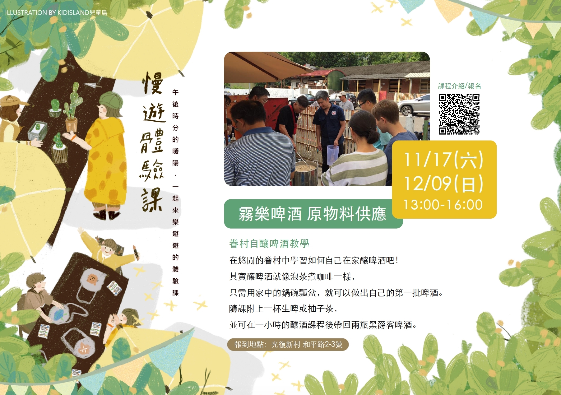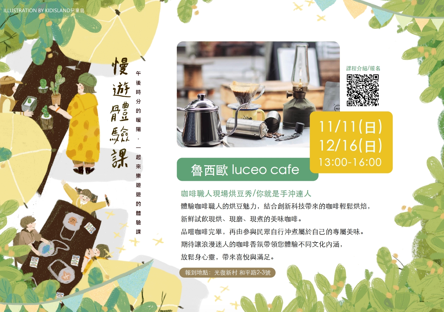 「光復新村的慢遊筆記」體驗課程邀請進駐青年擔任講師,開辦咖啡職人現場烘豆教學、乾燥花體驗、植物拓印、自釀啤酒教學等體驗課程,在1111日、17日、18日、25日、121日、2日、9日及16日,各課程均辦理2場次,持花博卡可優先參加,且每場前15名參加學員可優惠50%報名費,即每人繳交200元,就能享有基地導覽及創業體驗課程,可透過網路報名(掃瞄課程海報QR Code)或現場報名方式參加。