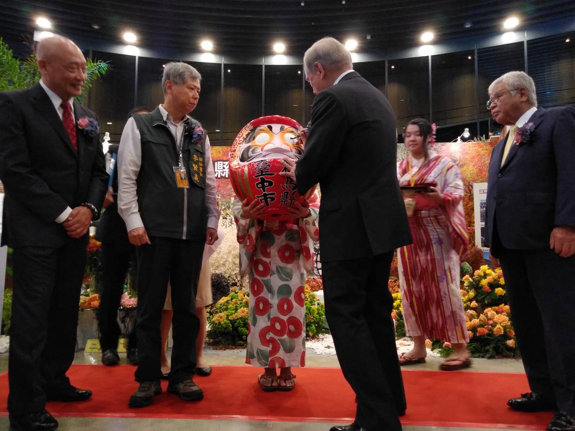 今日群馬縣來訪,市長林佳龍、觀旅局長陳盛山、裕毛屋企業董事長兼市政顧問謝明達均出席表達歡迎之意。雙方互贈禮物,並共同與群馬縣人氣吉祥物「達摩不倒翁」合影,象徵共同為花博祈福、帶來幸運。