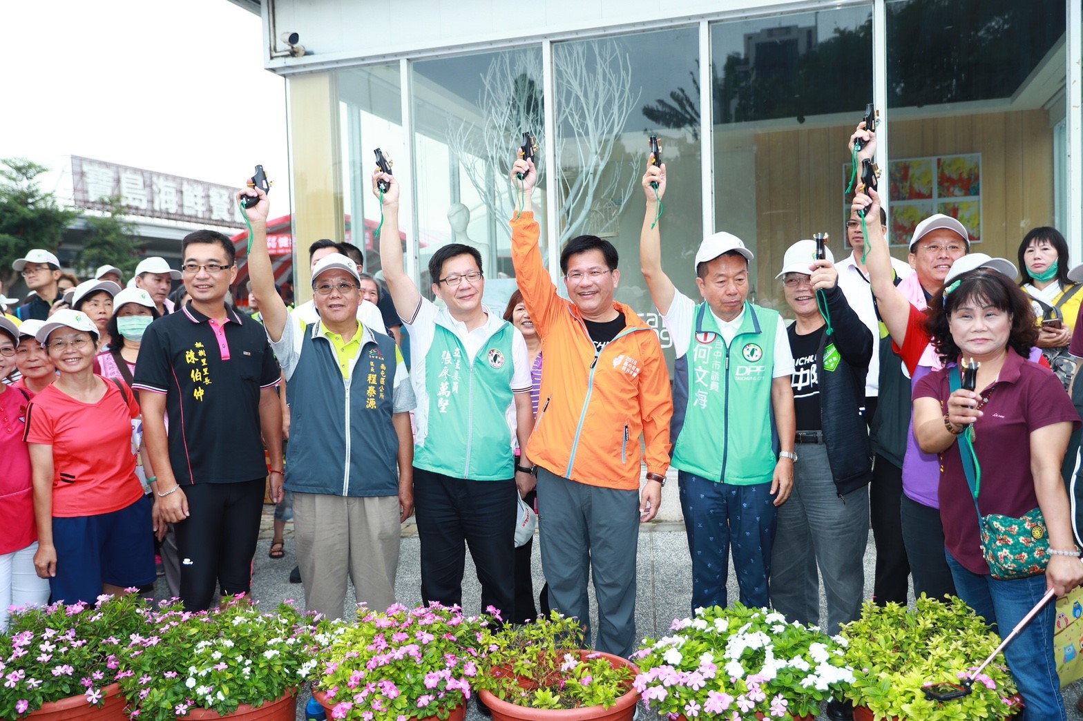 市長林佳龍在南屯區長程泰源陪同下出席今日的健行活動,為民眾加油打氣,並與立法委員張廖萬堅、市議員何文海及在地多位里長共同鳴槍,宣告活動開始。
