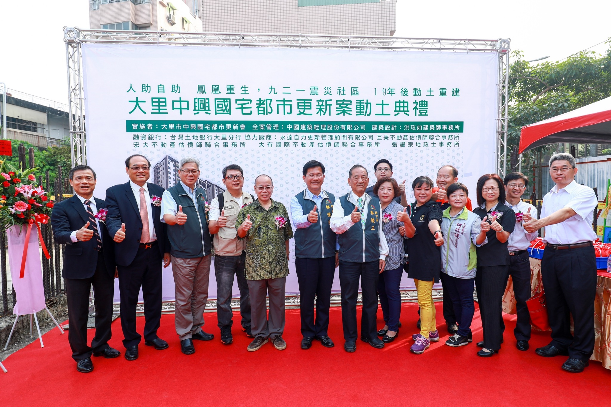 位於大里區的中興國宅都更案因921大地震倒塌,經歷19年終於透過公私協力重新啟動,今(11)日舉行動土典禮;市長林佳龍表示,市府積極進行都市活化再生,以都市更新方法推動社區重建,中興國宅完成後不僅落實居住正義,也將研議分配青年住宅,有助活絡地方發展,也讓青年勞工有房住。