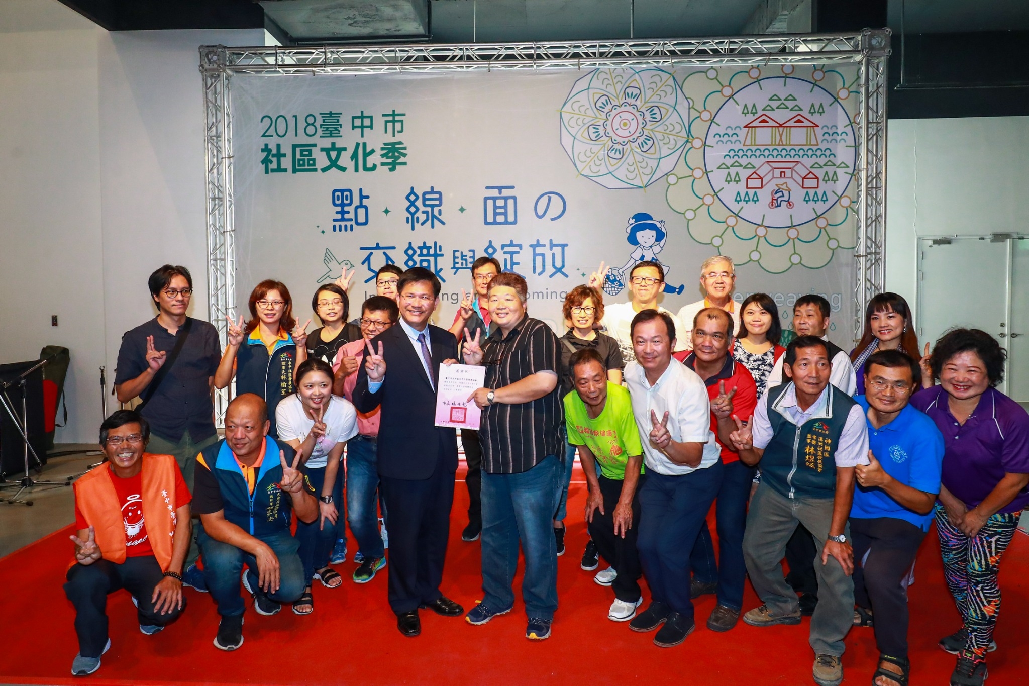 「2018台中市社區文化季—點•線•面の交織與綻放」在台中市纖維工藝博物館舉行為期6天的展覽,今(11)日舉行閉幕式,市長林佳龍頒贈感謝狀予121社造點及18區域型社造中心,鼓勵並感謝所有參與台中社造的團體,相信台中將透過社區營造,連結共好、存舊立新。