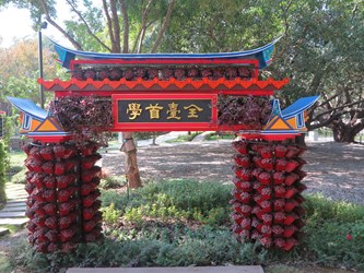 「全臺首學」為台南市佈展主軸,讓遊客彷彿到府城漫遊,結合老屋子、鐵窗花及各式磚材等老屋裝飾元素,加上劍獅作為展區內辟邪、鎮煞、祈福之用,展現府城之民俗傳統文化;同時以綠雕佈置台南市鳥凌波仙子水雉及國際級珍稀候鳥黑面琵鷺,搭配鹽田意象,呈現台灣早期生活艱辛的景象及台南市對生態保育的重要性。