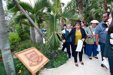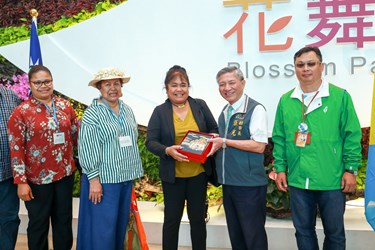 台中花博不僅是台灣的重大活動,也是國際盛會,友邦帛琉共和國總統雷蒙傑索賢伉儷日前率團來台進行國是訪問,今(12)日第一夫人雷黛比特別於訪台期間前往花博,由台中市副市長張光瑤親自接待,參觀后里園區花舞館的國際室內花卉競賽帛琉展位,以及森林園區國際庭園的「亞太友邦聯合庭園」,對於花博豐富、多元的規劃與展出,頻頻點頭肯定。張副市長表示,非常歡迎帛琉第一夫人雷黛比到訪花博,帛琉在花博后里馬場及森林園區均有參與展出,他們看到家鄉熟悉的景觀感到格外親切與開心,非常高興及歡迎他們的到來參觀。