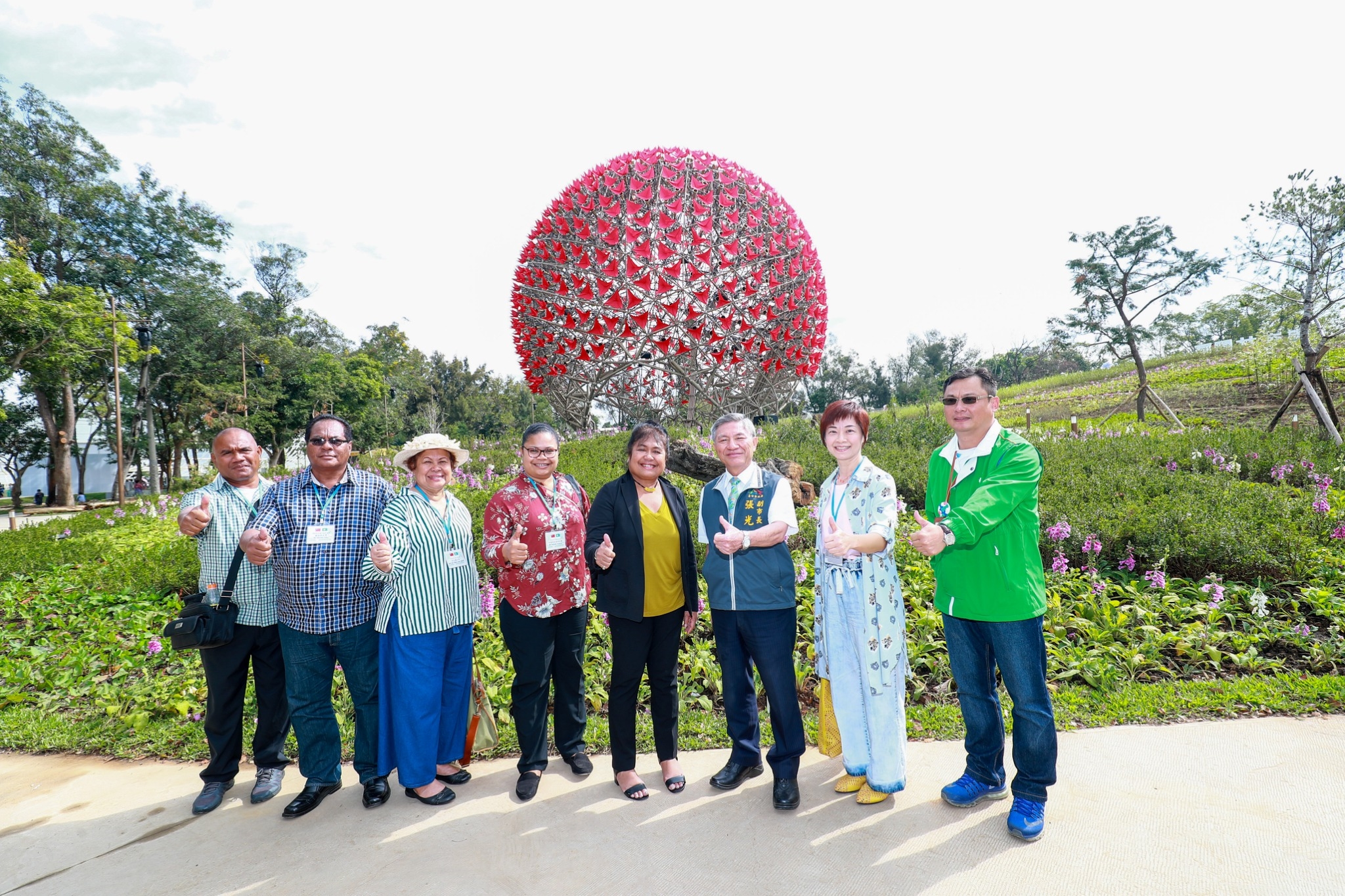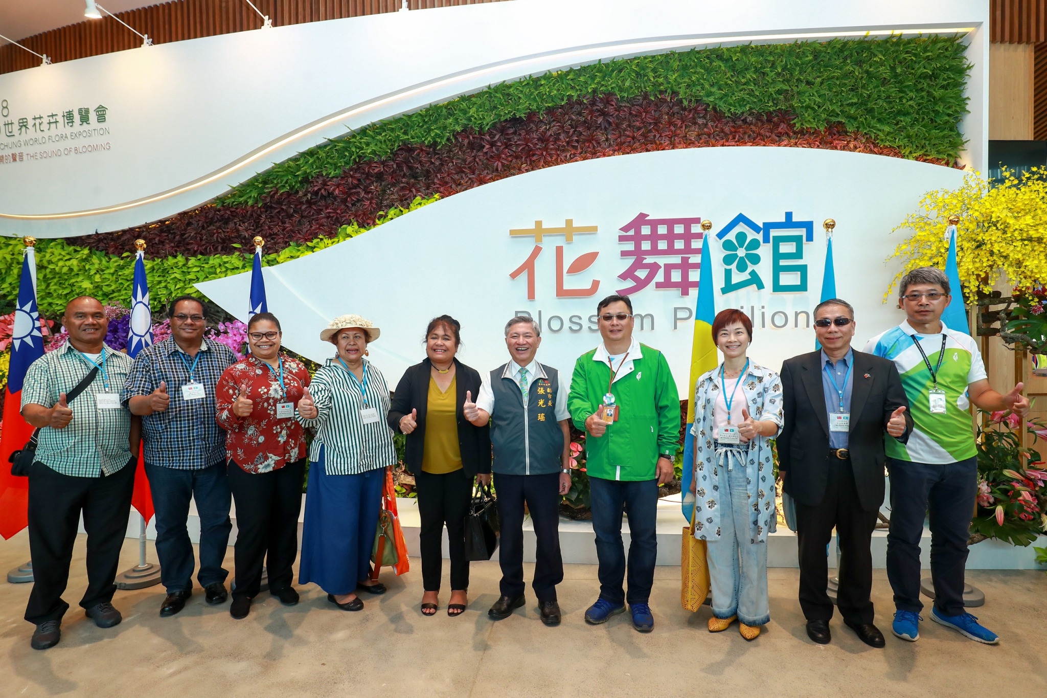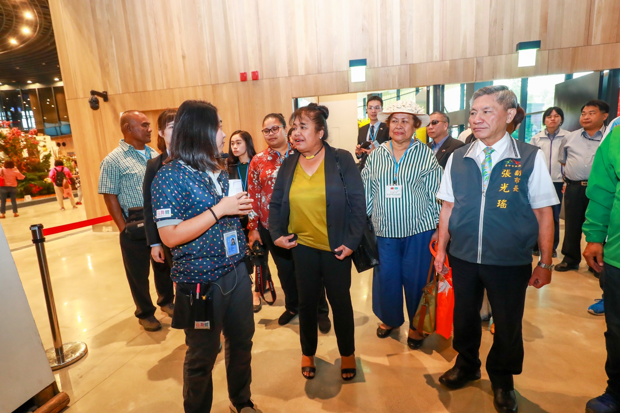 今日帛琉第一夫人雷黛比在副市長張光瑤、市府副秘書長郭坤明、帛琉駐台大使歐克麗、駐帛琉大使周民淦的夫人戴佑珊及外交部禮賓處王華榮公使等人陪同下,參觀后里馬場園區花舞館的帛琉國際室內庭園競賽展位,以及后里森林園區《聆聽花開的聲音》大型裝置藝術及亞太友邦聯合庭園。