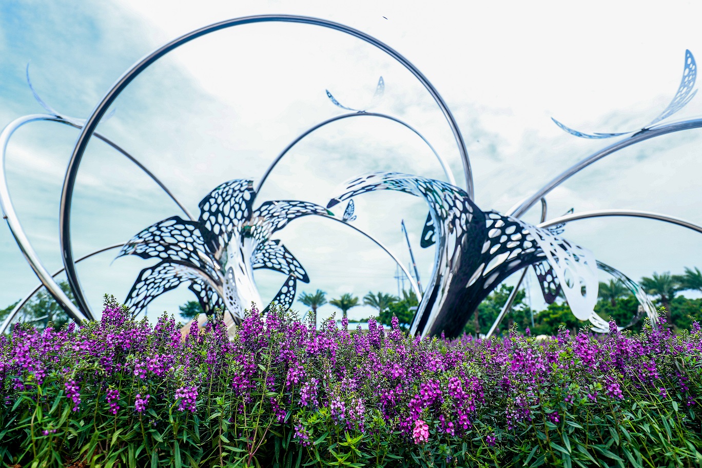 外埔園區「花漾舞春風 蝶影躍森悠」公共藝術裝置,以2朵台灣百合仰天綻放的姿態為意象,設置於園區制高點,並有蝴蝶翩翩飛舞停靠其間及地面,結合周邊欣欣向榮的景觀植栽,情侶來此一遊,不僅感受「花果原鄉」的主題精神,沐浴於燦爛陽光下,戀愛也充滿幸福之感。