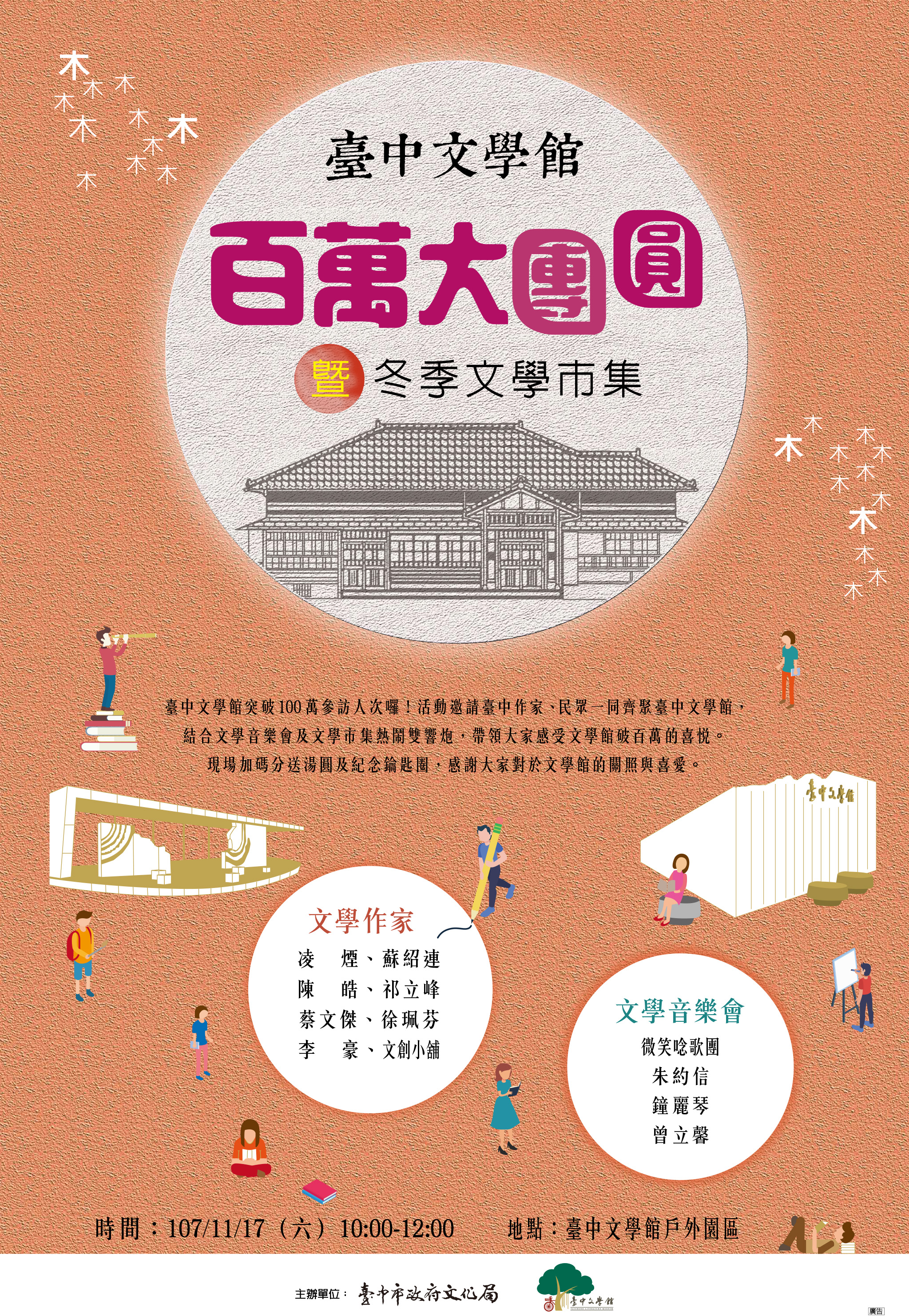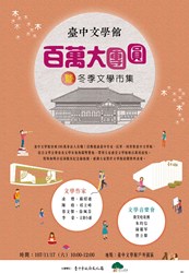 11月17日10時至12時在台中文學館戶外園區,將舉辦「百萬大團圓暨冬季文學市集」活動,其中包括文學音樂會,邀請微笑唸歌團、朱約信、鐘麗琴、曾立馨帶來表演,現場還有文學市集及活動摸彩,好禮包括電子書、圖書禮券、文創品、書籍等獎項,民眾可洽活動服務台領取摸彩券,每人限領1張,市集作家合影打卡送「文學書袋」、在百萬牆拍照打卡送「文學書札」等限量好禮,贈完為止!更多活動,可至市府文化局網站(http://bit.ly/2TjiYmj)查詢。