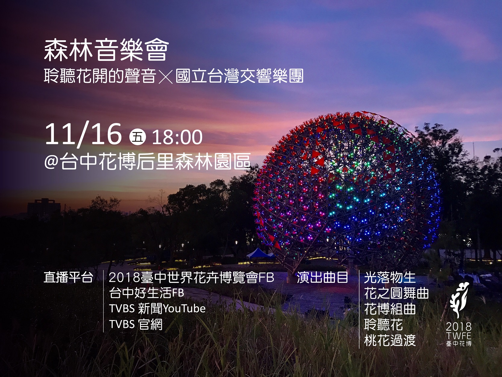這場森林音樂會將由國台交現場演奏「花之圓舞曲」、「桃花過渡」,以及由「雨夜花」、「菅芒花」等6首台灣歌曲改編而成的花博組曲;另外還有豪華朗機工為機械花打造的曲目「光落物生」、「聆聽花」等新創樂曲,與機械花朵開合、光影轉換相呼應,將有視覺及聽覺截然不同的體驗。「國立台灣交響樂團 × 聆聽花開的聲音森林音樂會」演出資訊請至花博官網( https://2018floraexpo.tw )查詢。