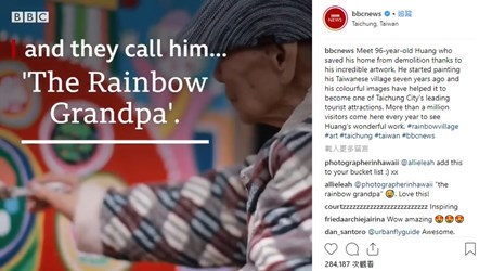 英國廣播公司(BBC)報導指出,彩虹眷村是台中市知名景點,每年吸引超過100萬遊客參觀。BBC Instagram上發布貼文分享彩虹爺爺專訪,更獲網友盛讚彩虹眷村之美「Amazing!」、「Incredible!」,IG上觀看次數已逾28萬。