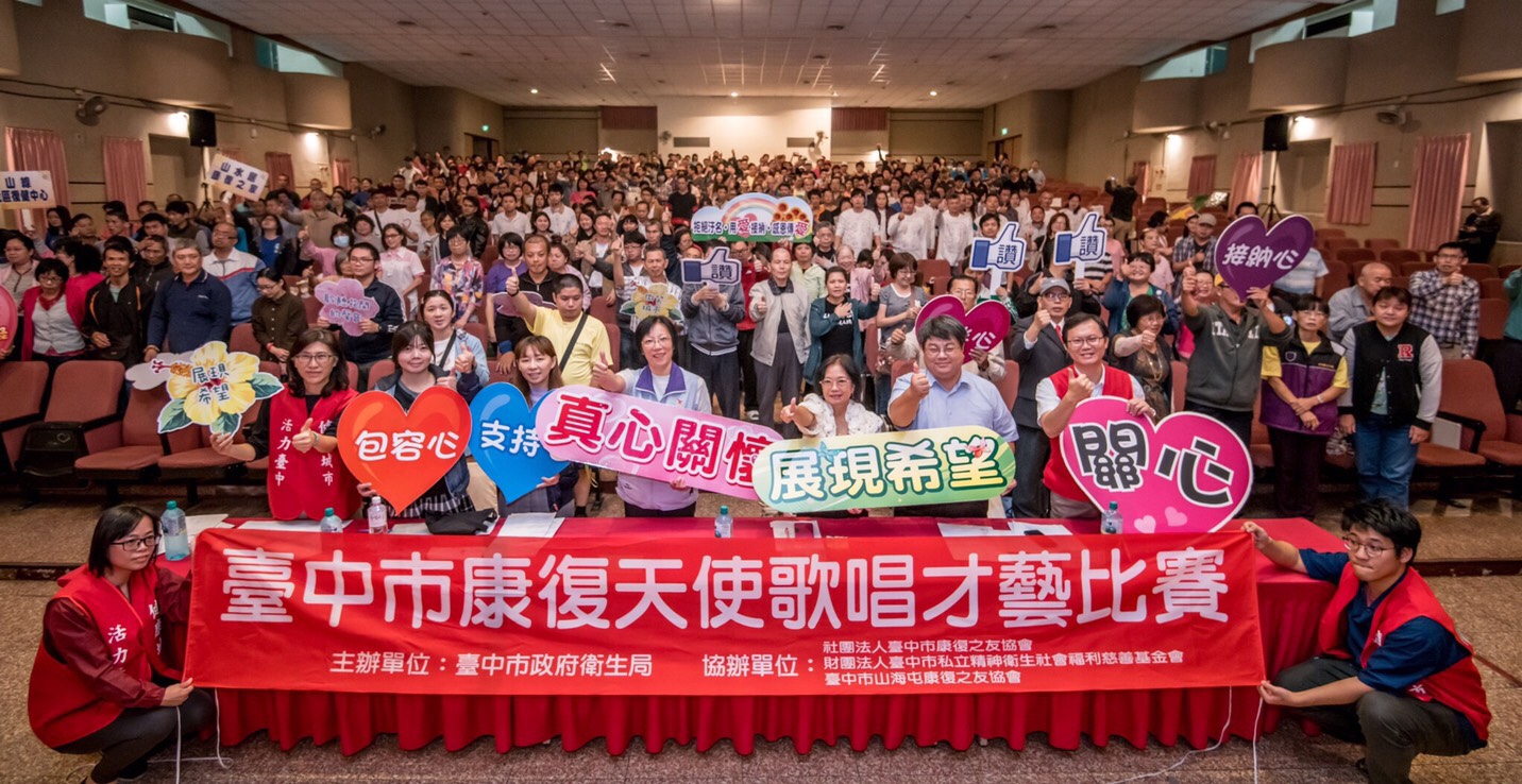台中市政府衛生局今(17)日在南屯區豐樂公園演藝廳舉辦「康復天使歌唱才藝比賽」,約500多位病友、家屬及相關醫事人員共襄盛舉,項目包括社區關懷病友獨唱及二人合唱,以及由各機構病友組隊參加的才藝比賽,形式涵蓋歌唱、舞蹈、戲劇、音樂劇等,展現創意及活力。