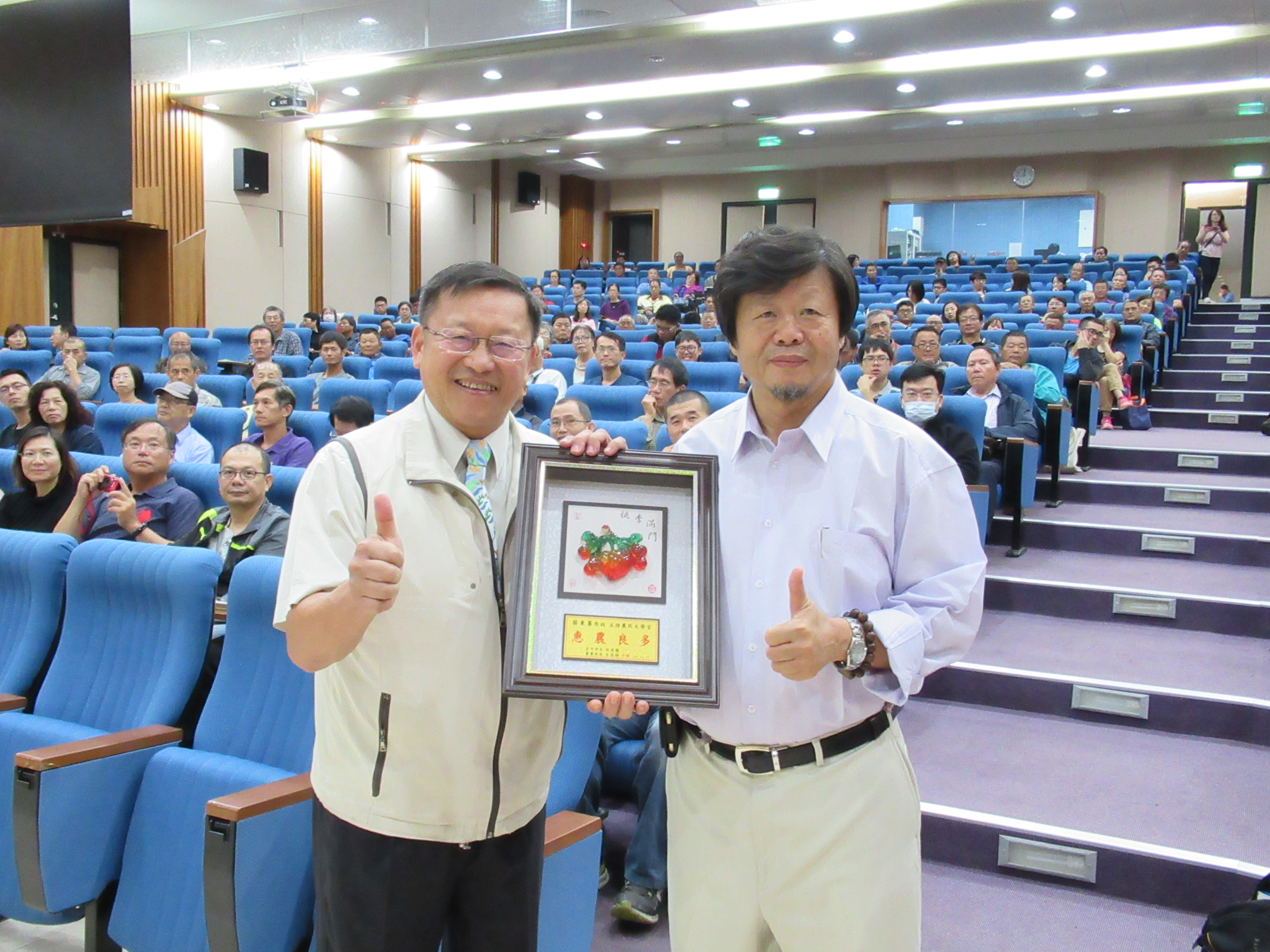 農民大學堂自104年開辦以來,至今已辦理48場次,累計1萬7125人次參與,今(17)日台中市政府農業局長王俊雄頒獎表揚主講人蔡東纂教授,感謝蔡教授長期為台中及台灣農業的付出,不僅培育許多農業人才,也解決各種農業疑難雜症,使眾多農友受益。蔡東纂教授受獎時表示,「這輩子沒做完的,下輩子再回來繼續做」,表達他為台灣農業無悔付出的心聲。