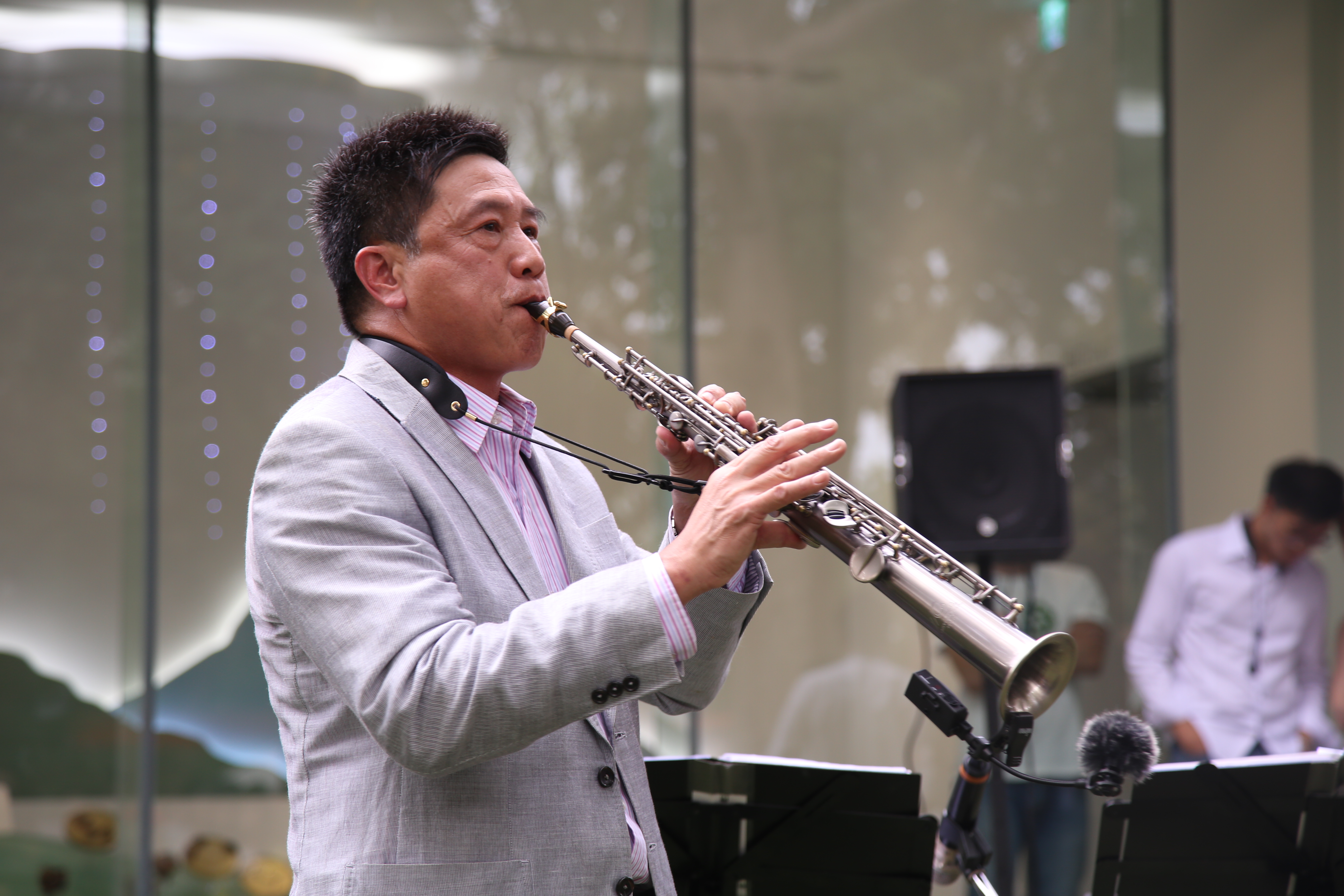 副祕書長郭坤明表示,友達不僅贊助微美館,更出動1500位企業志工在館內排班,彭董事長原先也打算來當志工幫忙導覽,後來想到當初友達在后里設廠時,發揚在地薩克斯風文化的初衷,希望讓遊客感受到在地特色花博微美館,因此特別率高階主管在今天帶來薩克斯風演出。