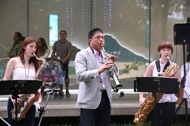 台中花博開幕後,友達微美館556吋大螢幕拼接牆,已成后里森林園區必訪景點,今(17)日友達光電董事長彭双浪為讓花博遊客感受后里在地濃厚薩克斯風文化,下午特別率友達高階主管組成的「WOW SAX」薩克斯風樂團與張連昌薩克斯風四姐妹四重奏一同到微美館,獻出花博處女秀,現場演奏小城故事、My Heart Will Go On等耳熟能詳的歌曲,吸引眾多遊客圍觀欣賞。