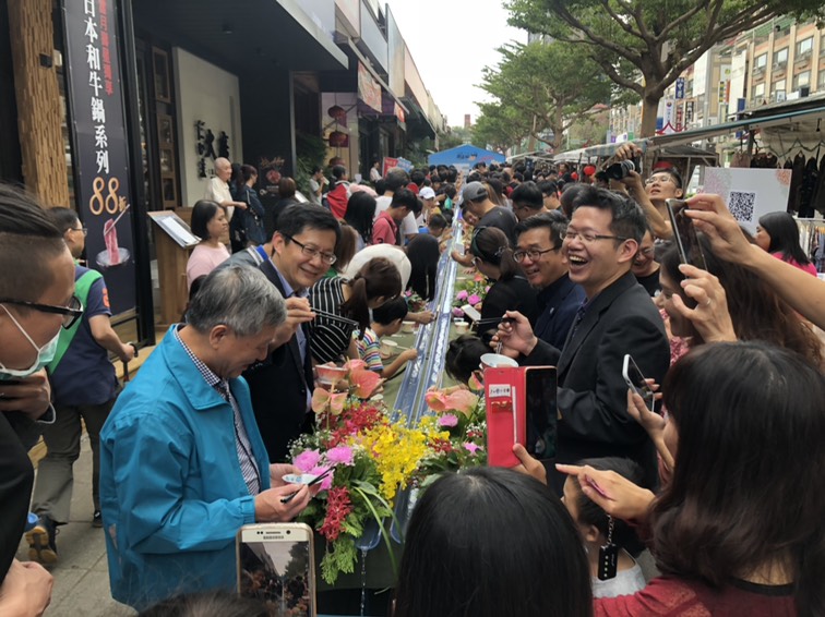 市府經濟發展局表示,中科購物廣場特有15米寬人行道,地形往福科國中方向緩降坡的特性,恰好適合流水麵長度並能克服水勢問題,民眾領取號碼牌進行體驗;穿著日本服裝例如和服、浴衣、武士服等來體驗的民眾,更能獲得店家提供禮券。