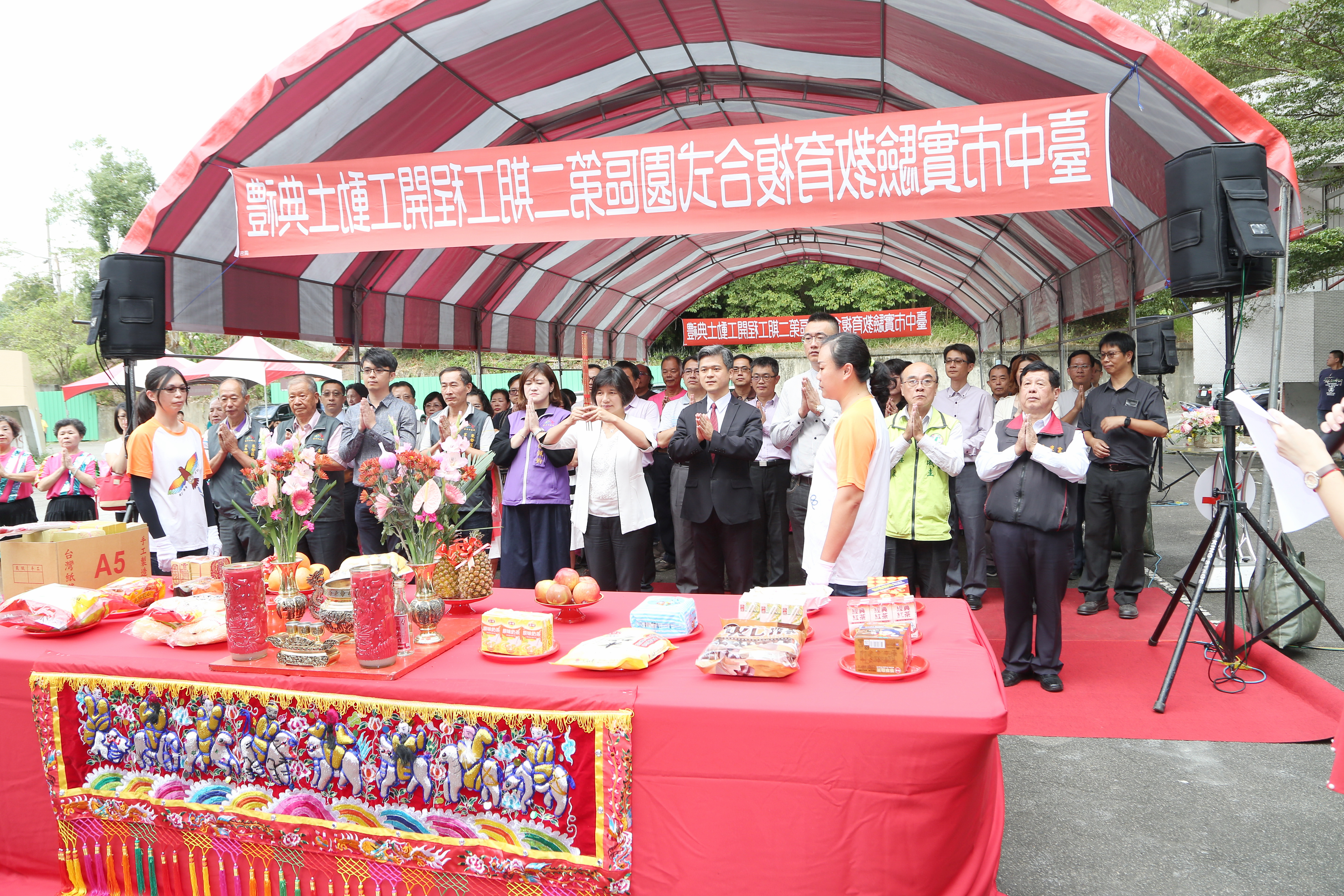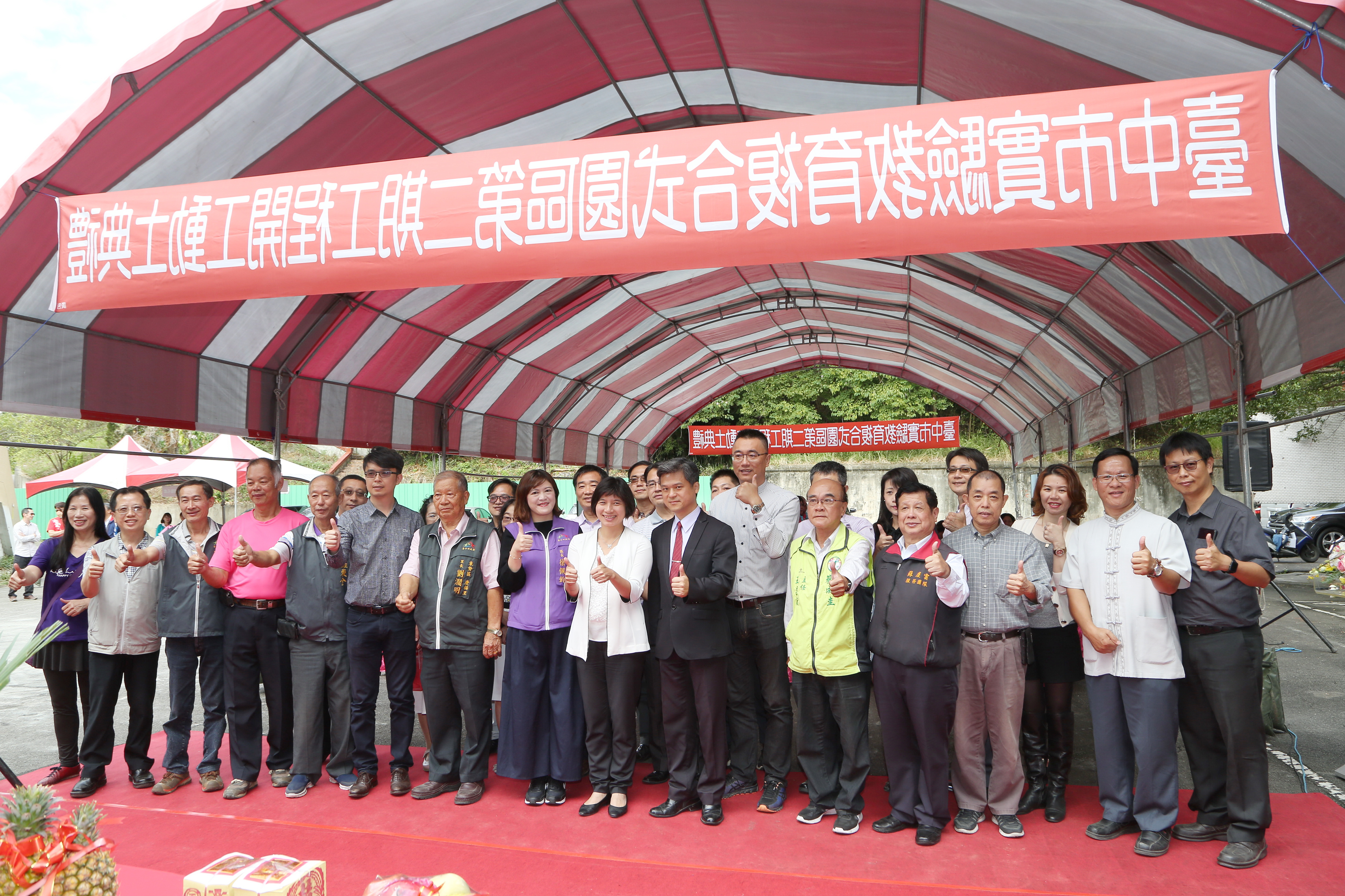 今日動土典禮,副市長林依瑩、教育局長彭富源、東勢區長徐佩鈴及市議員蔡成圭、蘇慶雲服務處代表一起見證與祈福。