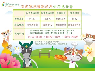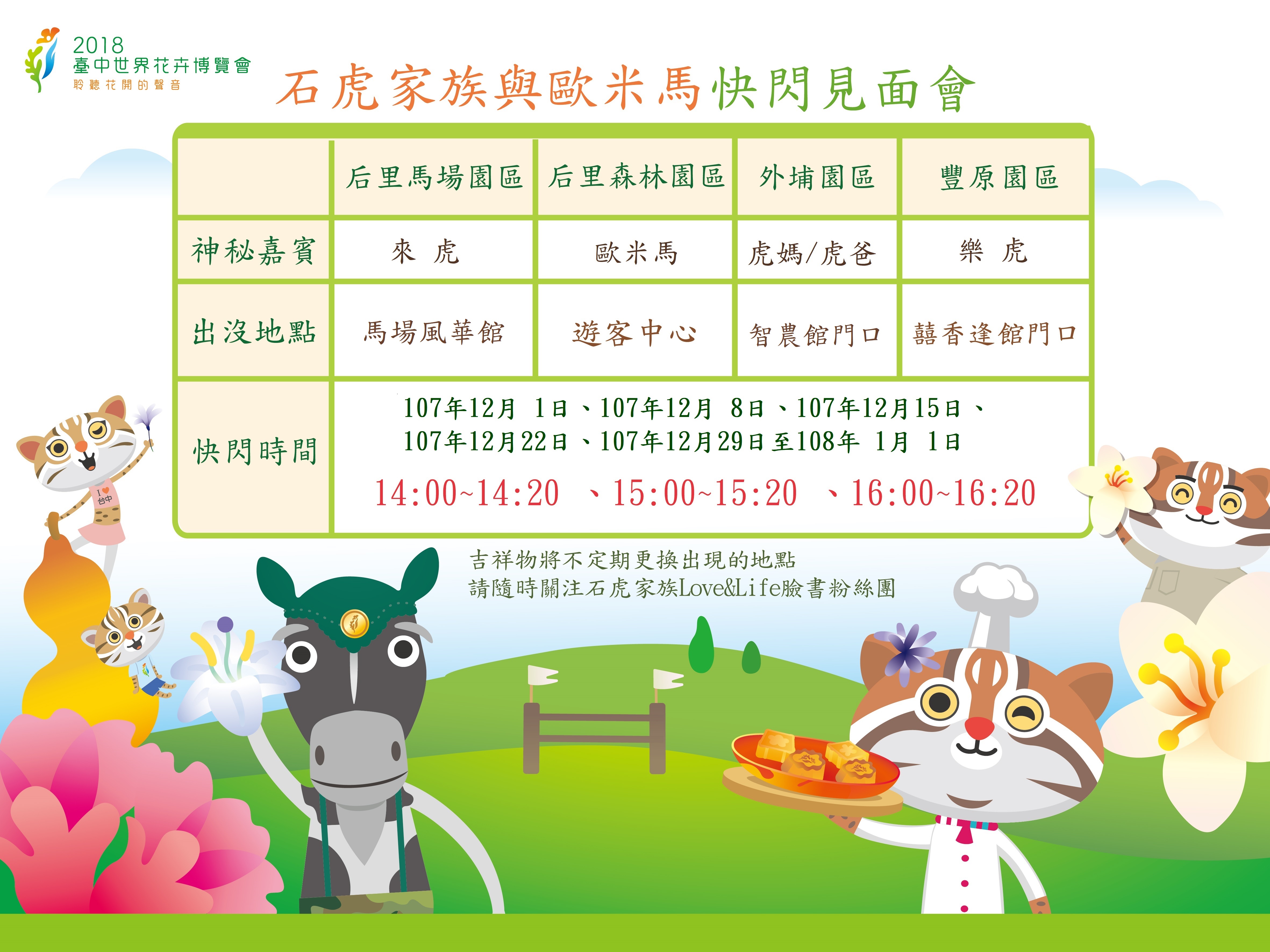 台中花博開幕後,掀起熱潮,吉祥物「石虎家族及歐米馬」也成為超人氣明星,其中花博吉祥物家族短劇廣受小朋友歡迎,12月在外埔園區有3場次,週末122日就有一場,將由YOYO家族的番茄姐姐、羚羊哥哥與花博吉祥物陪大家同樂;另外,121日在后里馬場園區、后里森林園區、外埔園區、豐原葫蘆墩公園均有吉祥物快閃見面會,千萬別錯過哦;「2018新社花海」將於121日至16日,在新社區種苗改良繁殖場第二農場舉行,今年以「新社花海行,樂遊台三線」為主題,展現山城自然景觀、農業生態與地方產業文化,並結合台中11處休閒農業區,設置「休閒農業區與農特產品展售區」,活動精彩又豐富,週末來趟花海之旅吧!