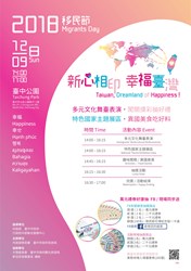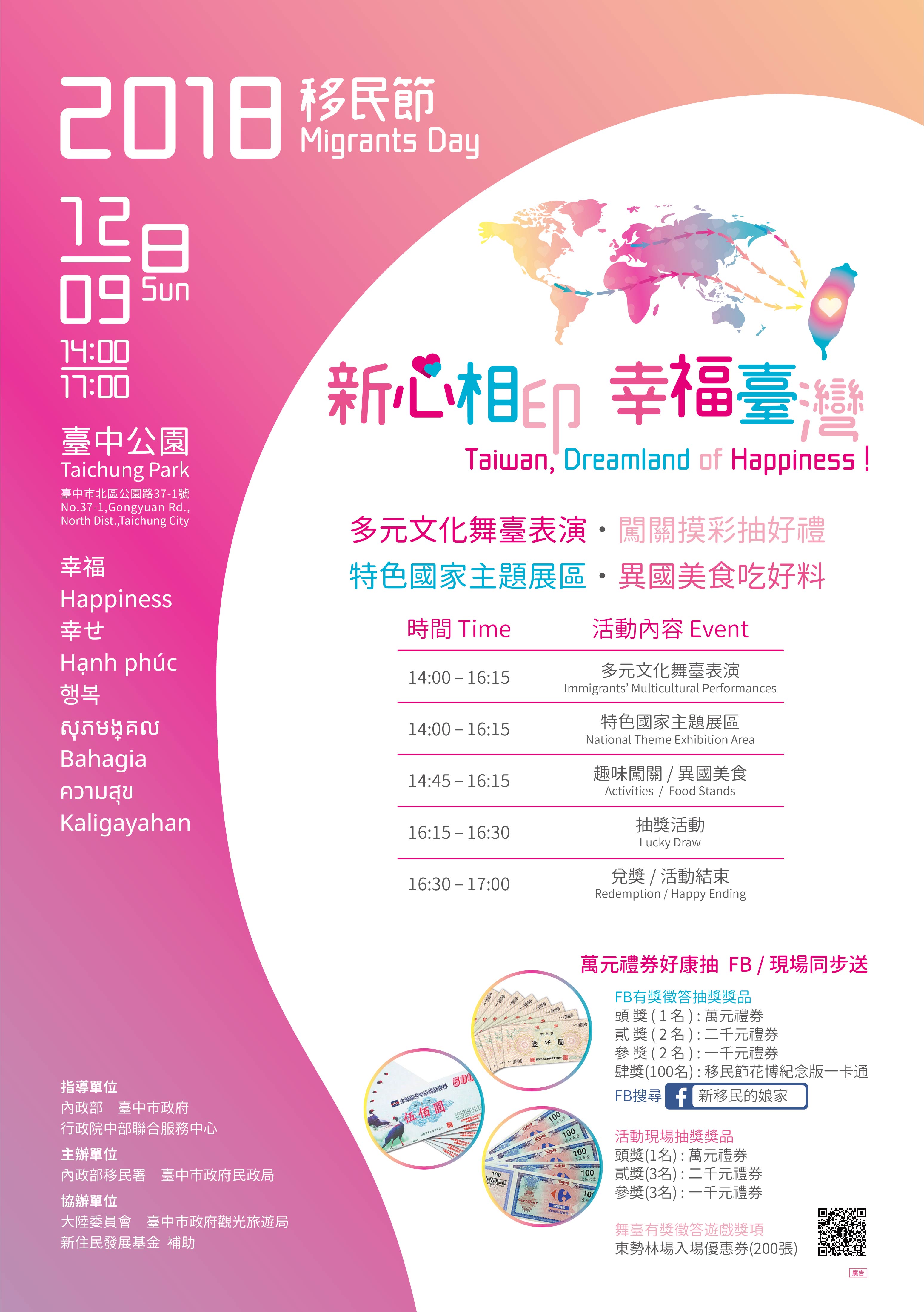 台中市107年移民節慶祝活動,12月9日下午2時至5時在台中公園登場,當天除有精彩多元文化節目表演與多元文化主題展示各國文化,還有闖關摸彩活動,有機會獲得1萬元禮券,歡迎踴躍參加!本週還有不少展覽、演講等活動,更多資訊,請見「中市週末活動看板1208_1209」。(12/7*6)*新聞局