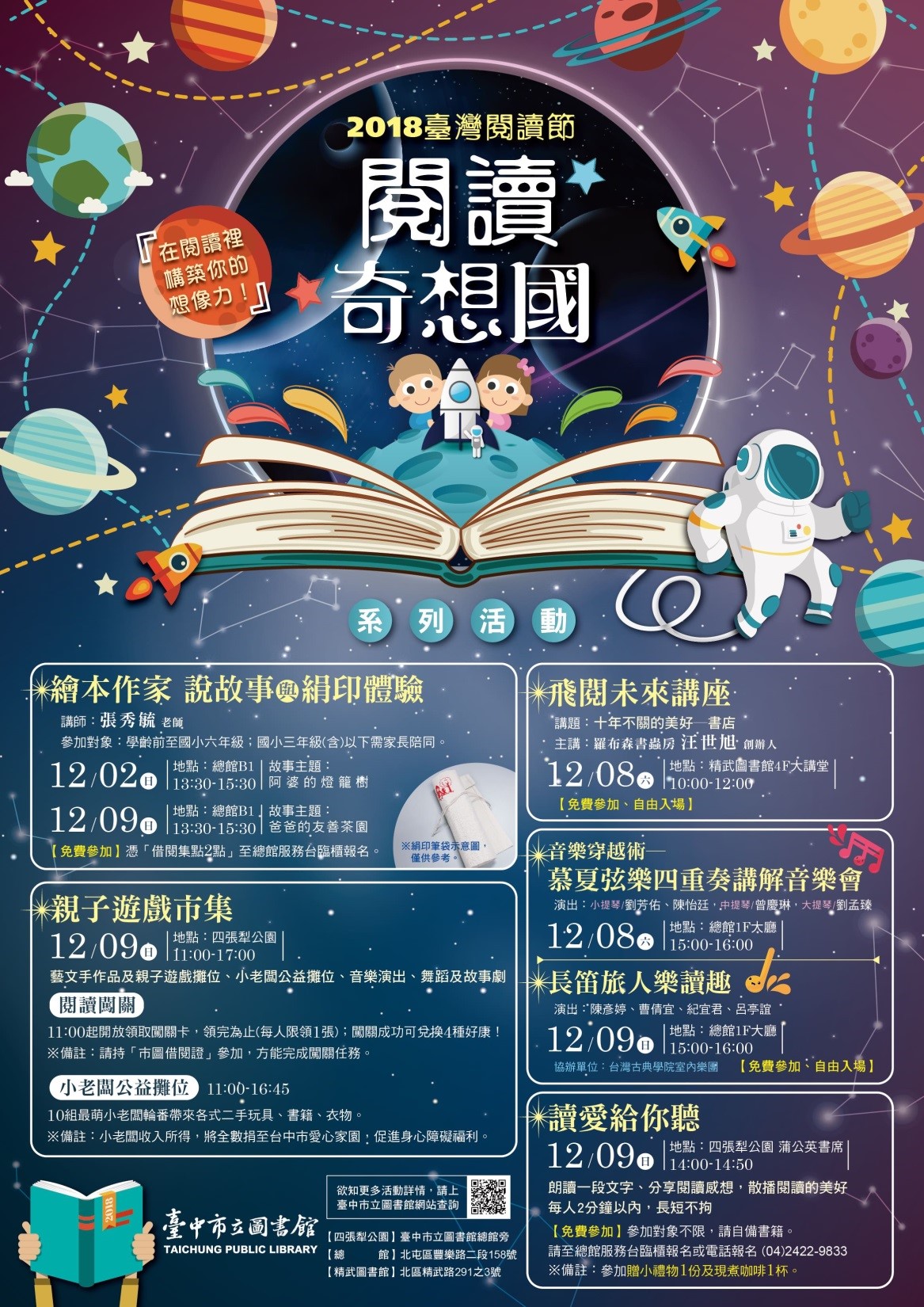 台中市立圖書推出為期一個月的閱讀奇想國系列活動,溫馨陪你到年底!萬眾矚目的親子遊戲市集於12月9日早上11時到下午5時在北屯區四張犁公園舉行,除了平面設計、手作的原創商品,更有許多讓大人童心未泯、小孩High度滿點的攤位:「喵手頑親子手工皂工作室」帶來手工皂、護唇膏DIY課程;「一噢山樹」則有飛天胖達等機構玩具、拉繩玩偶與木製擺飾;「原選良品」團隊來自屏東、高雄等原鄉各部落,提供各式原鄉工藝品。