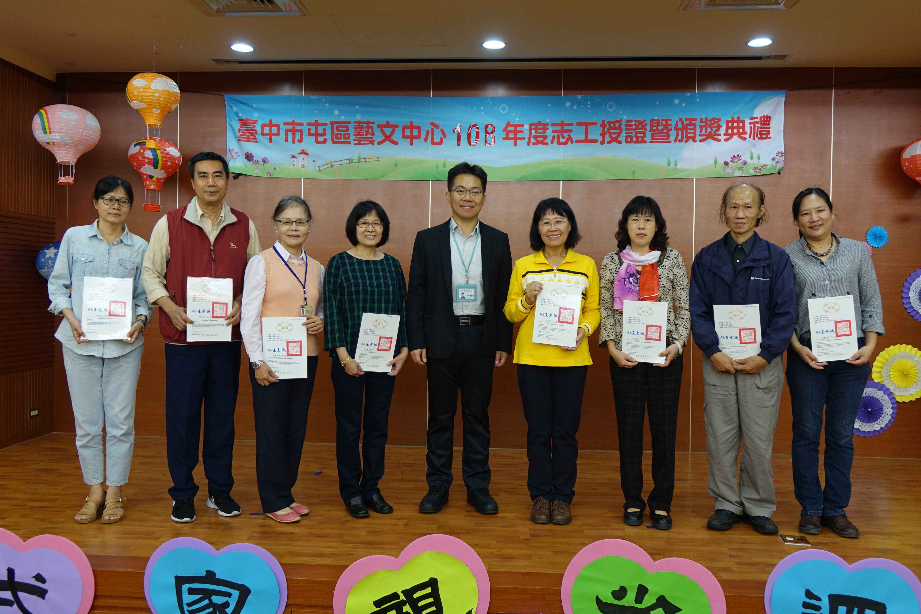 台中市屯區藝文中心今(15)日舉辦「108年度志工授證暨頒獎典禮」,感謝志工夥伴支援各項活動、館室展覽及活動策畫等,台中市副市長張光瑤出席頒獎時表示,今年屯區藝文中心志工隊124名夥伴,提供服務總時數逾18,000小時、服務民眾約30萬人次,有6名志工獲得衛生福利部及台中市志願服務獎章,締造良好績效成果,感謝志工在服務崗位上盡心付出,讓每場藝文展演活動圓滿成功。